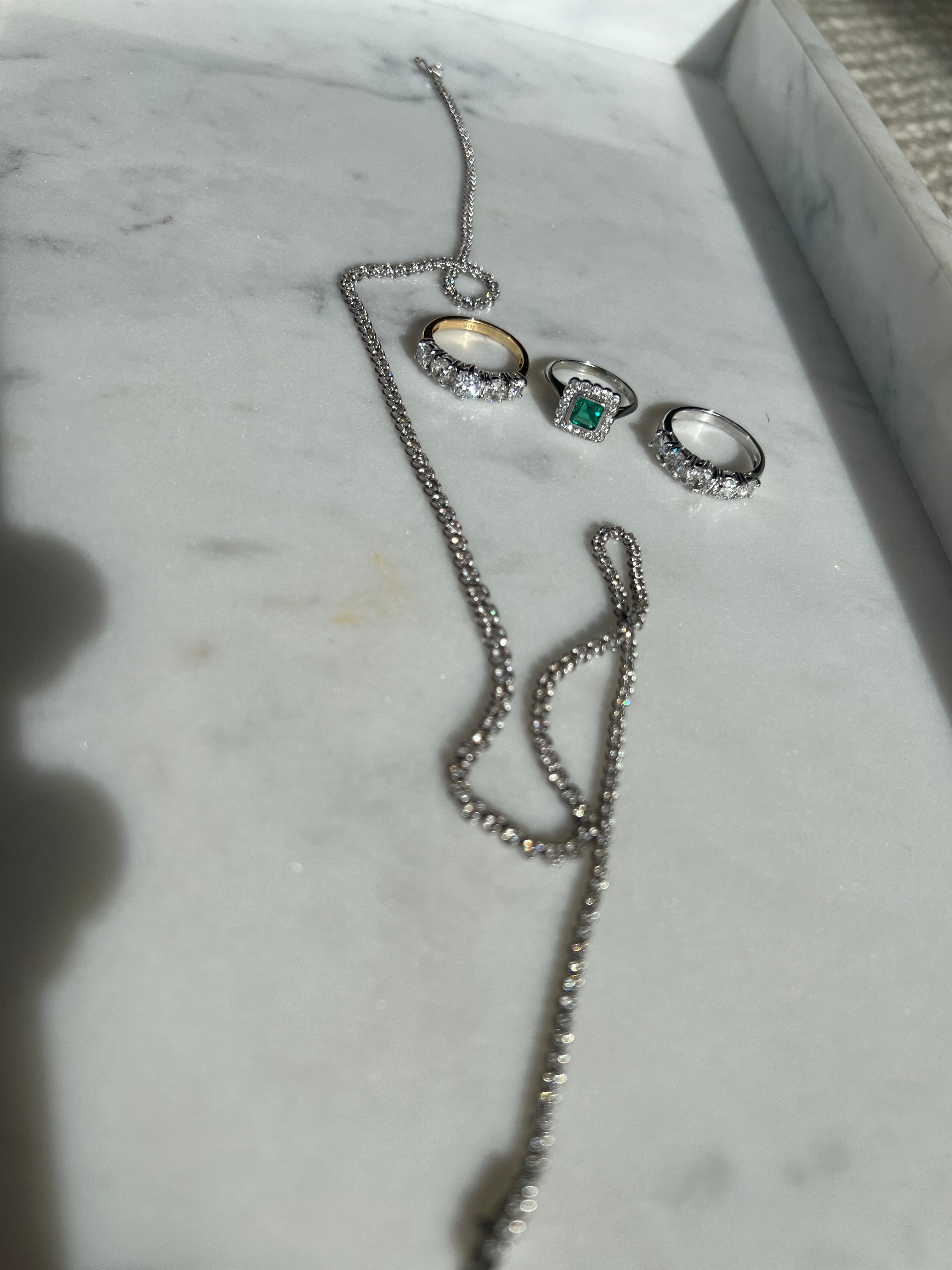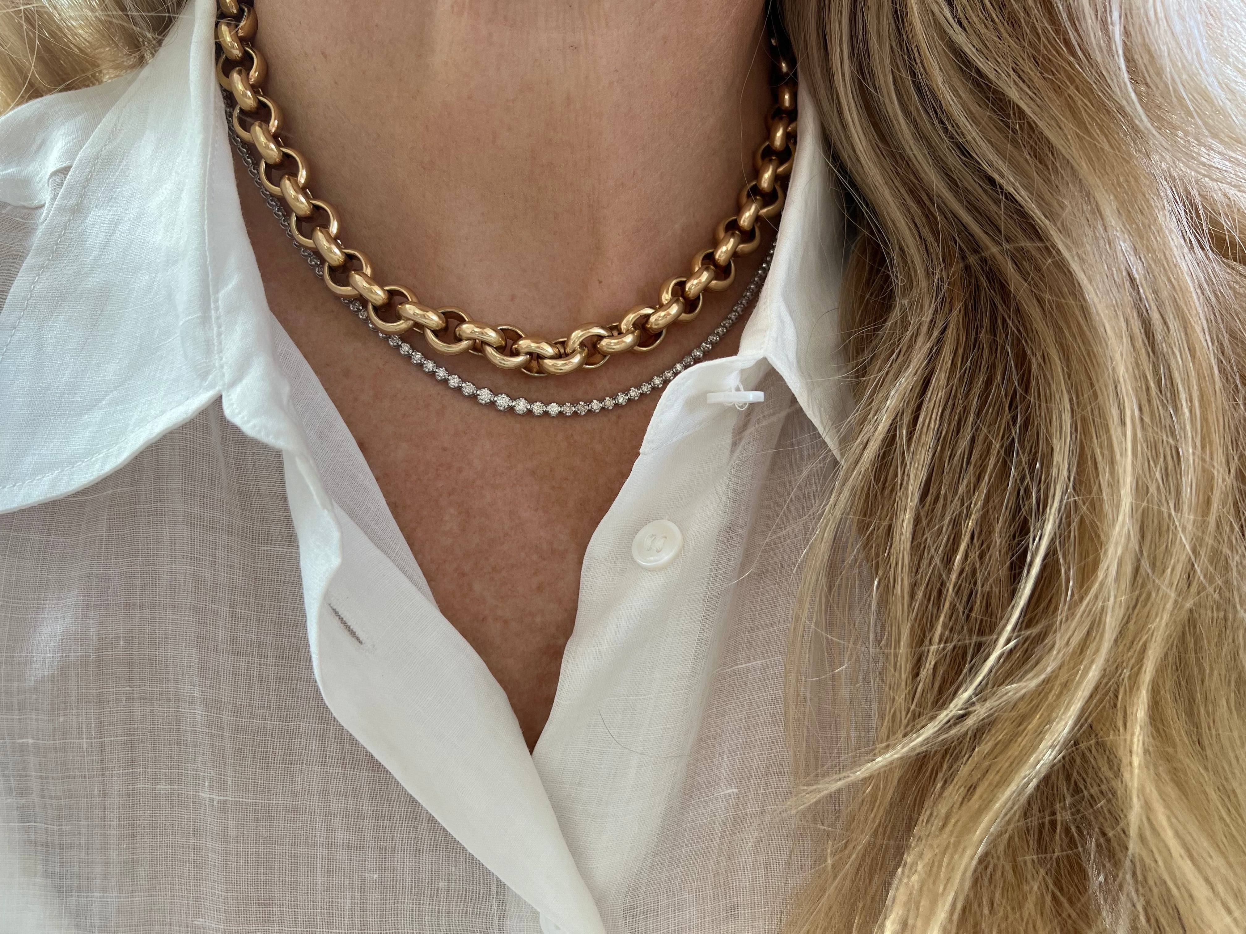 She looks beautiful worn alone, but I love her stacked with other chains, a real statement piece, but not over the top. She is special enough to wear with a ball gown but could just as easily be worn with a t-shirt. I bought her for a good price so she is very competitively priced, you will be hard pressed to find even a lab grown version at this price. A stunning wear every day piece.