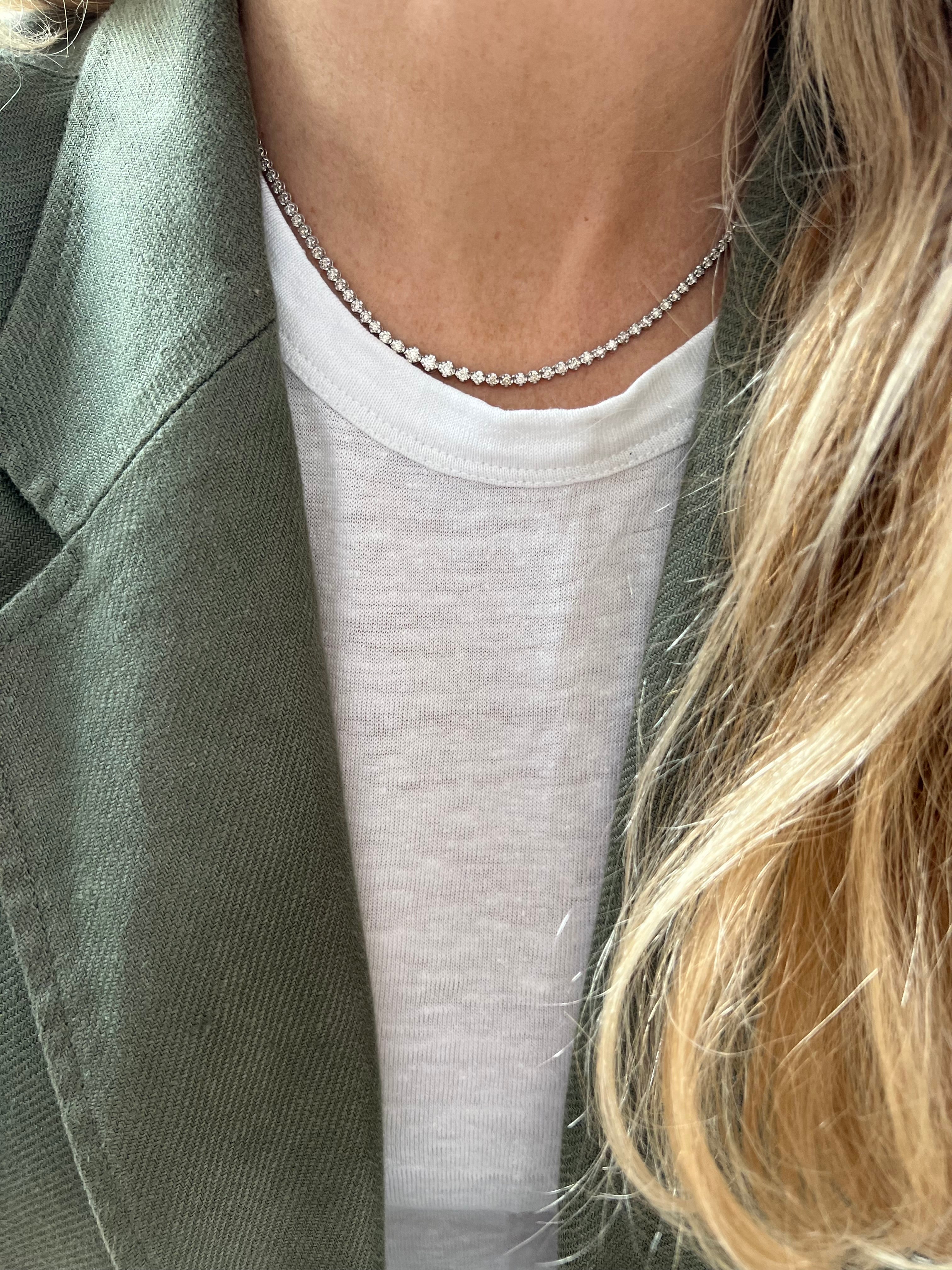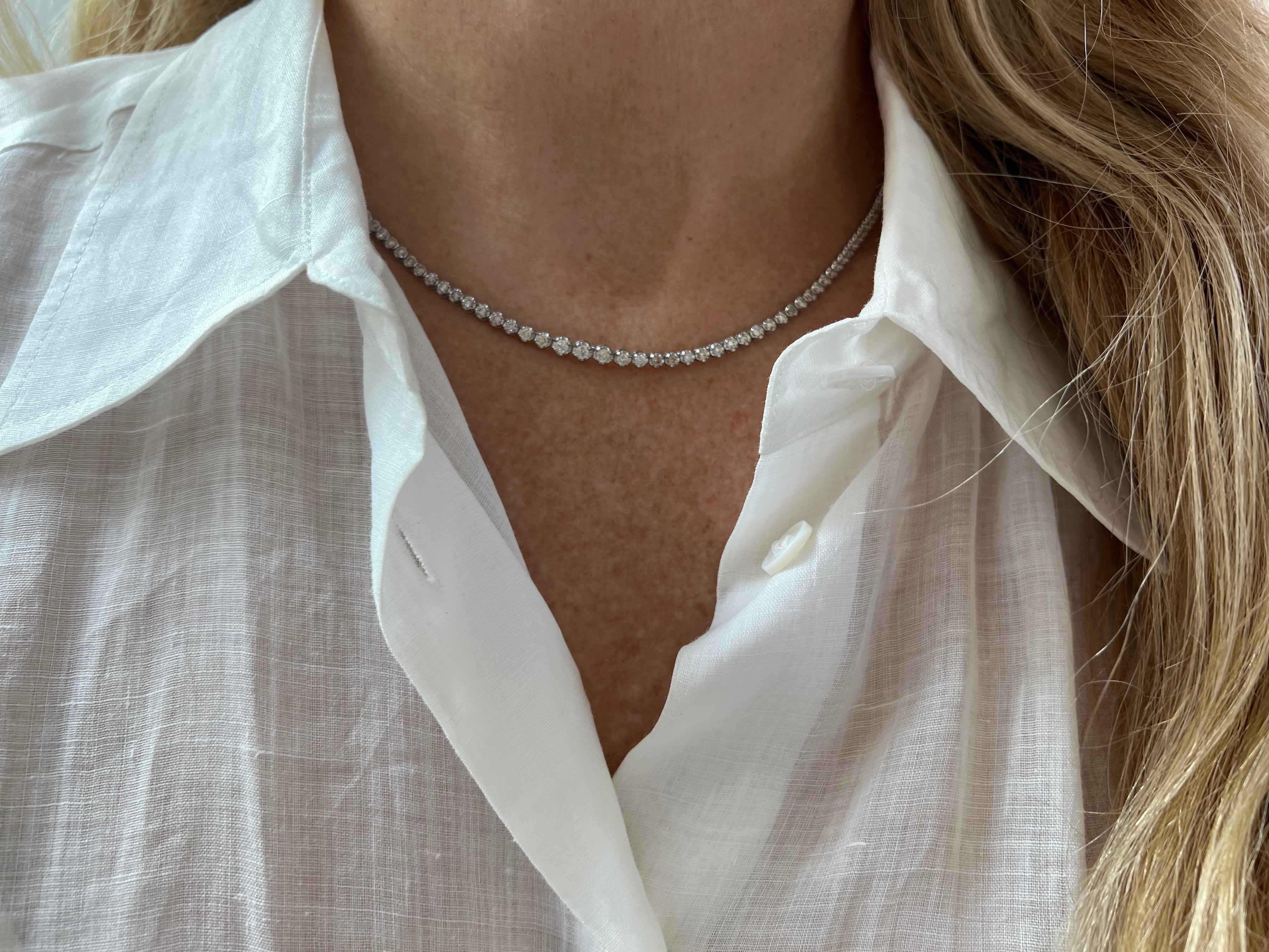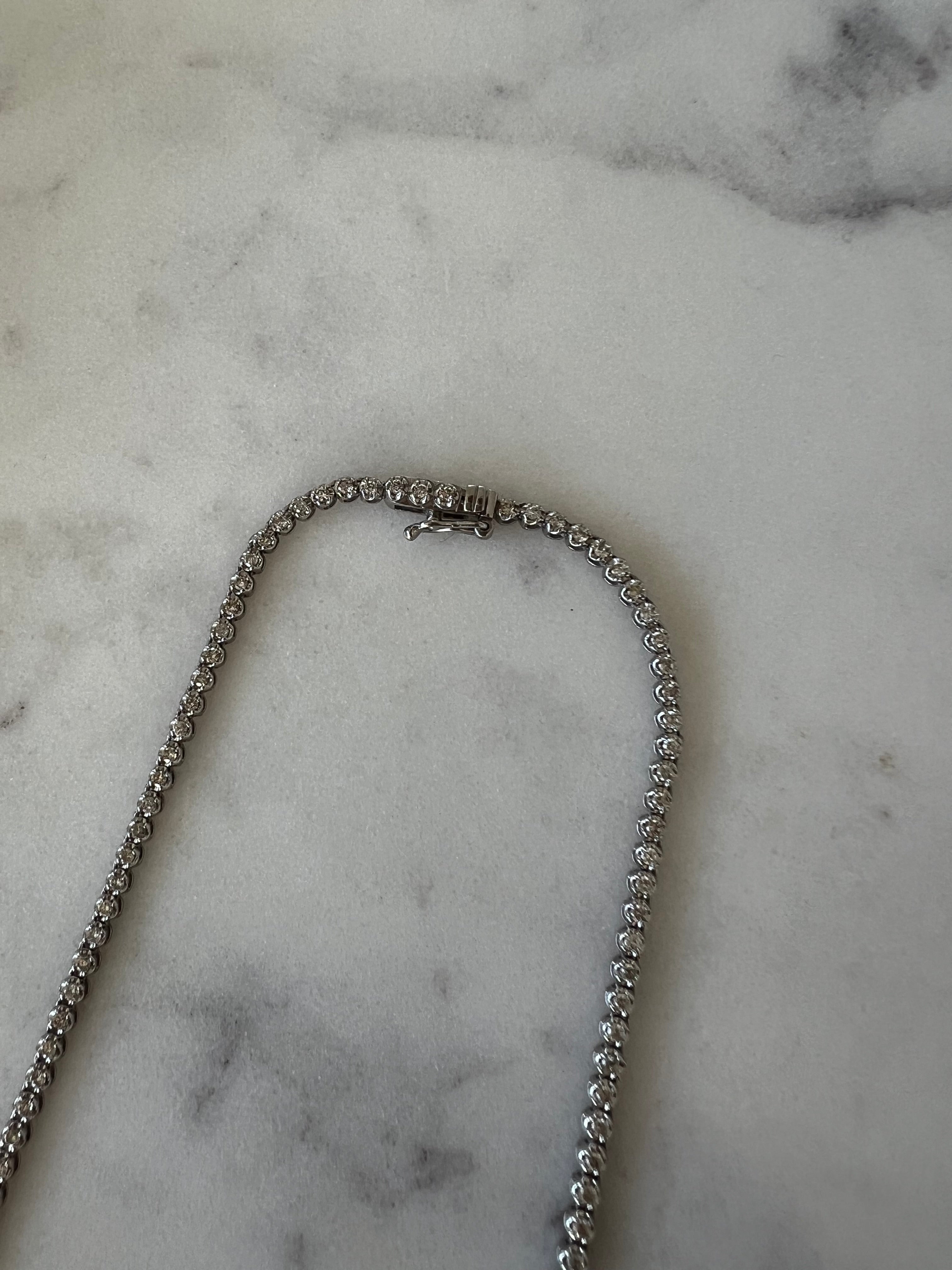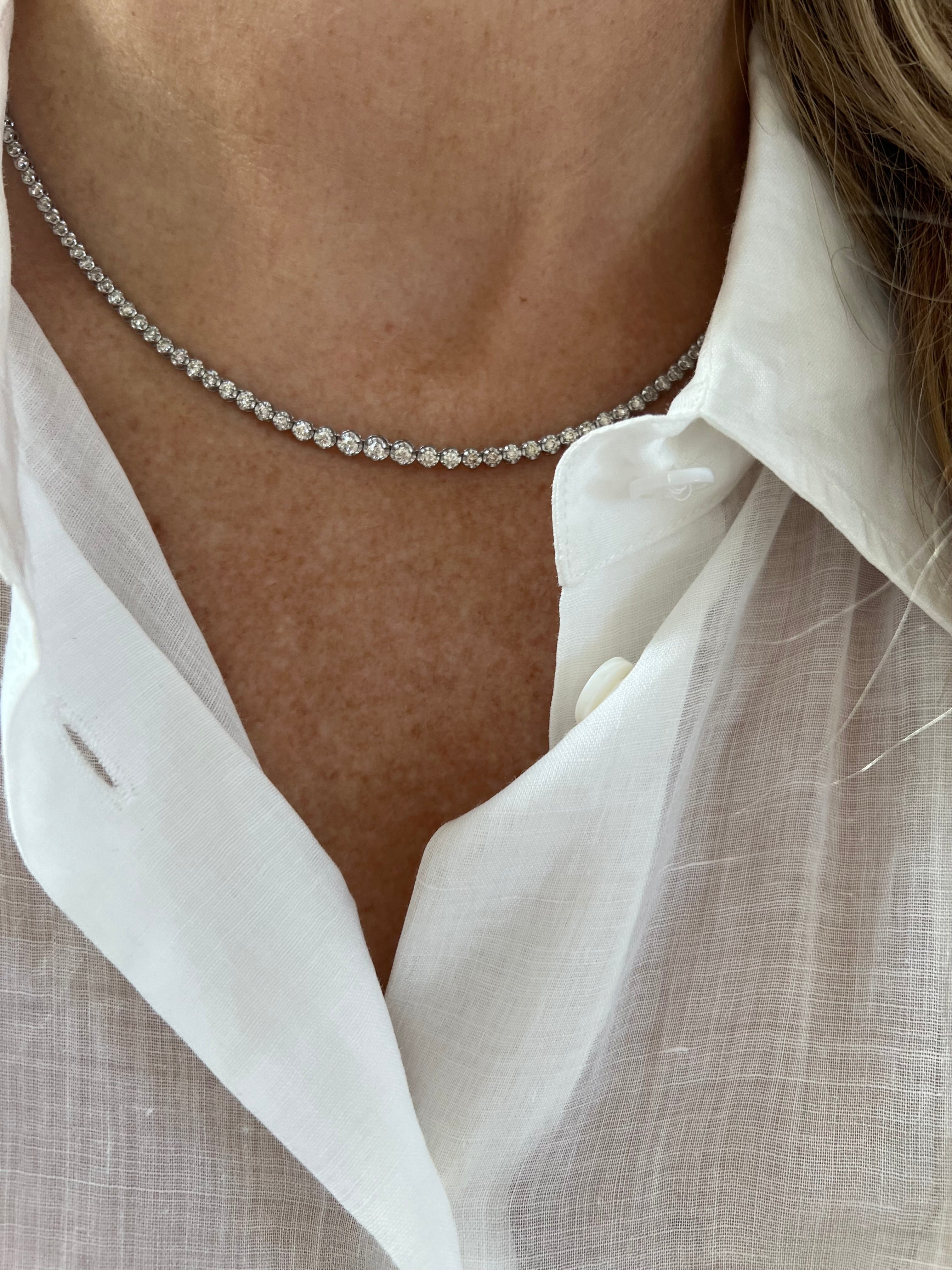 The perfect diamond riviere or tennis necklace. A beautiful classic, fashioned in platinum with three carats of natural diamonds.