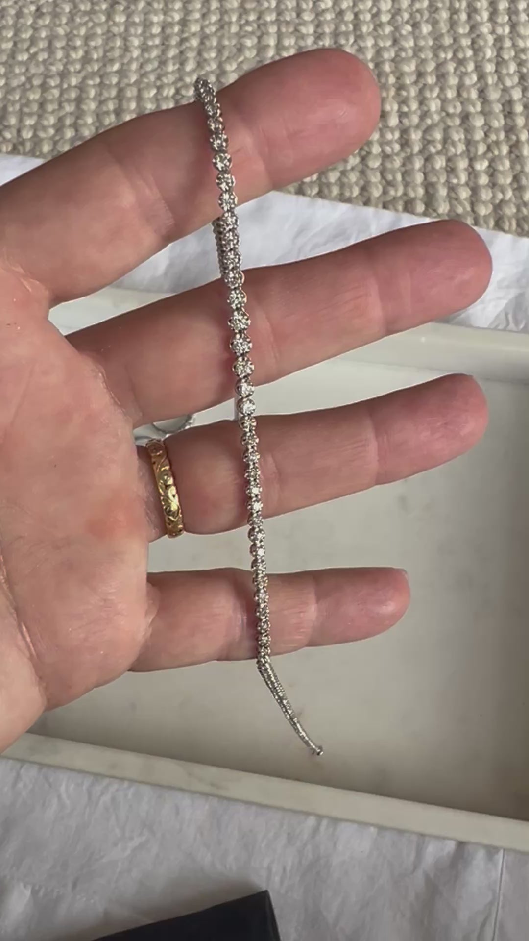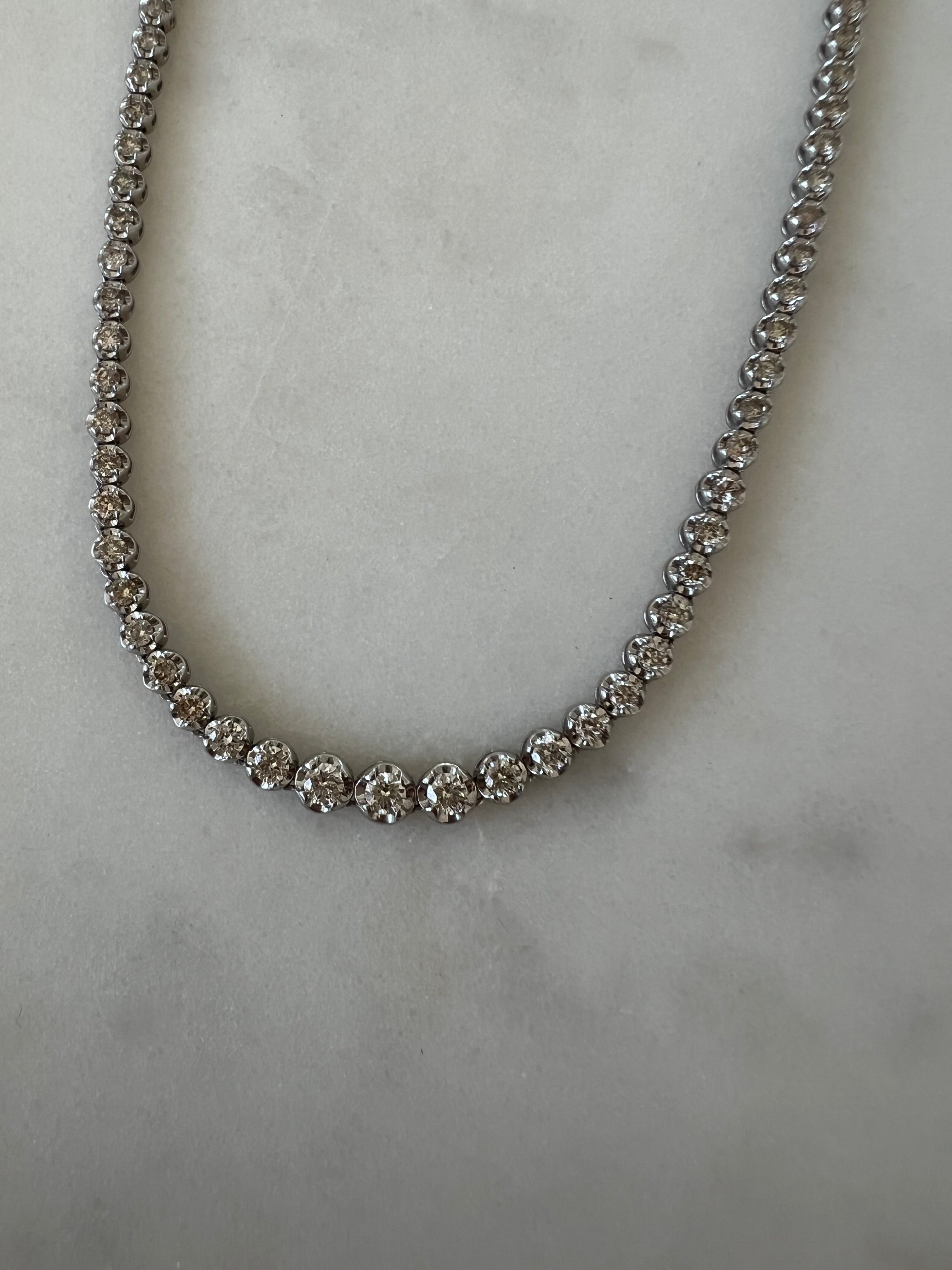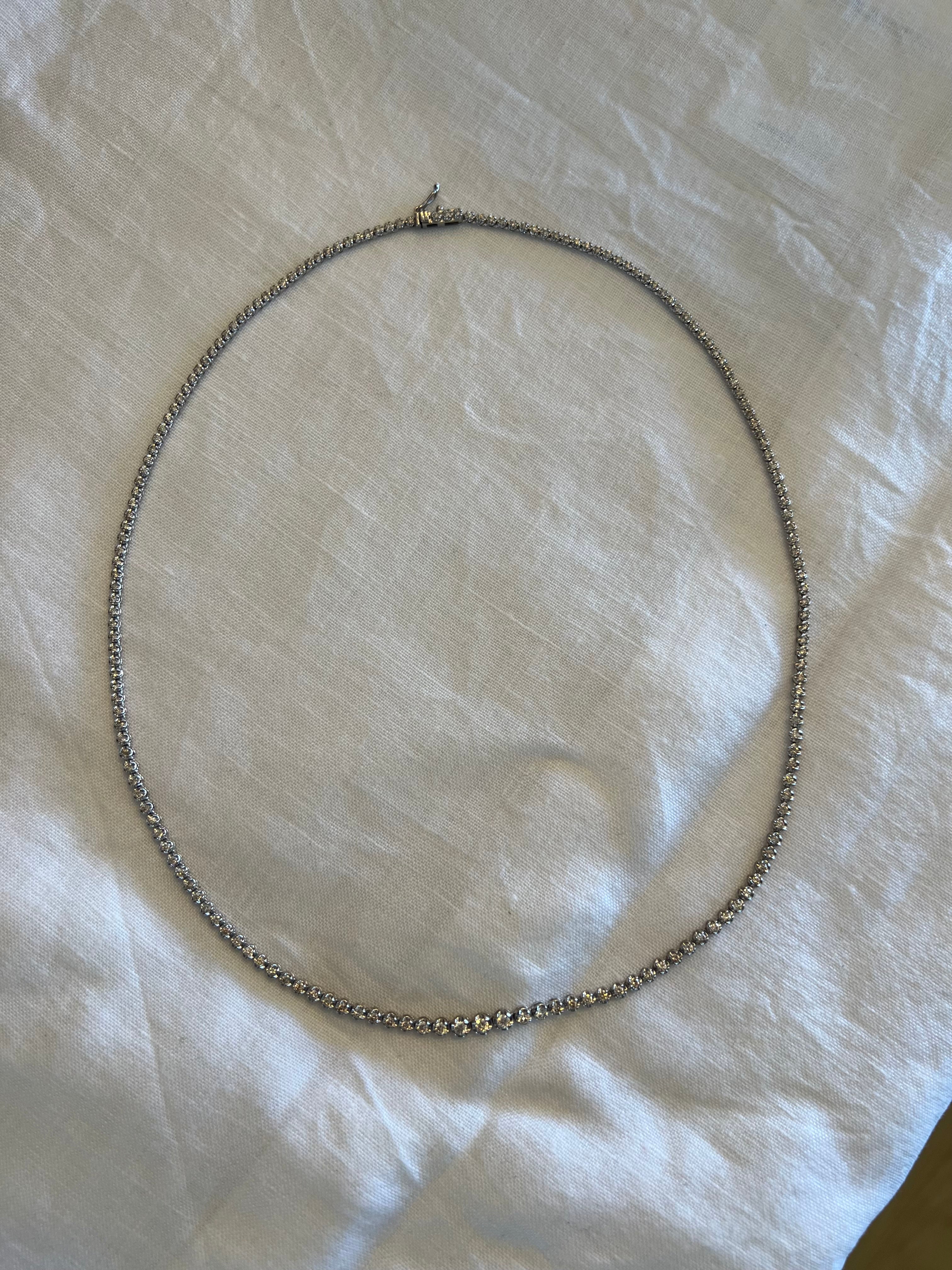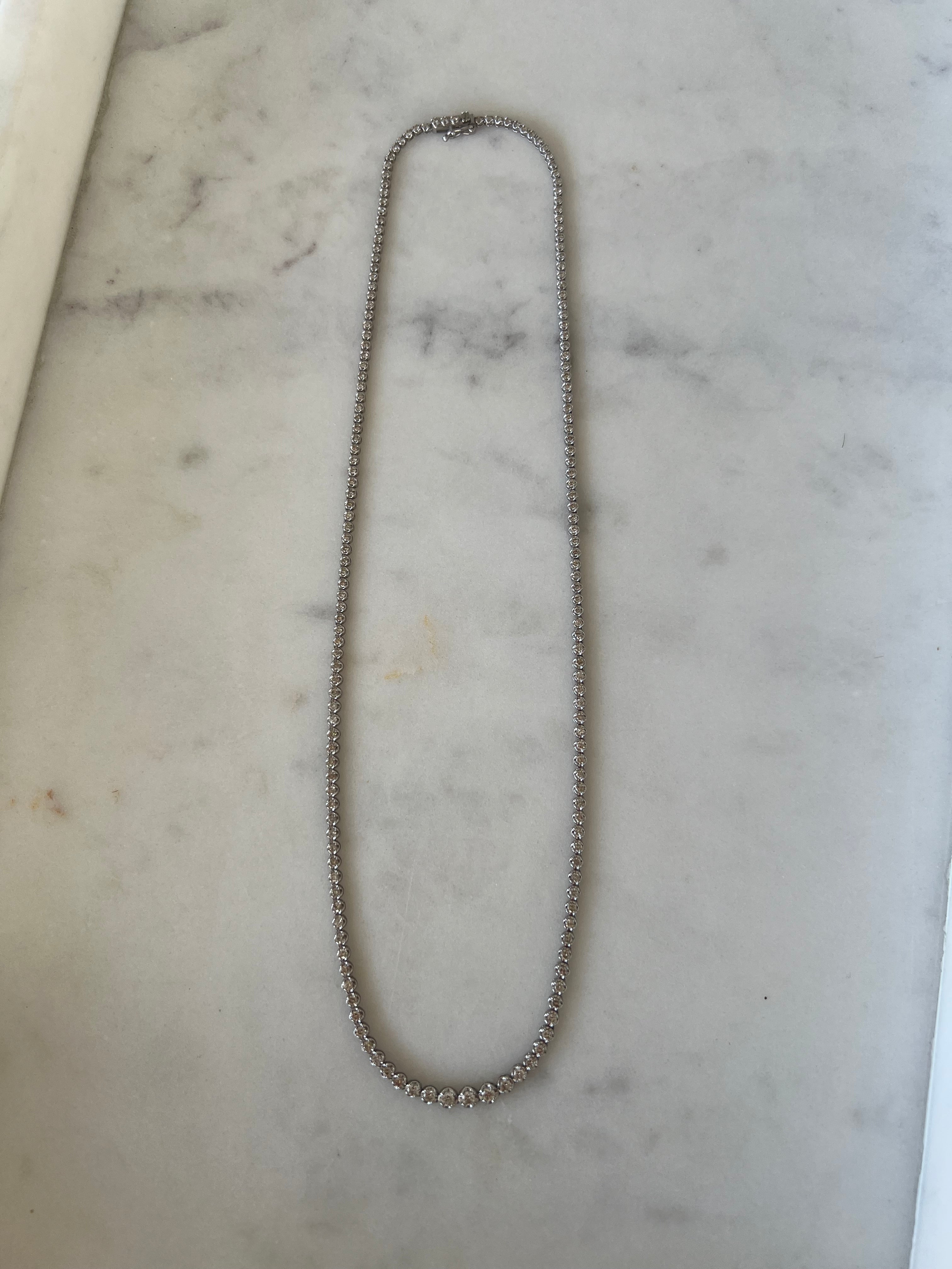 It doesn't get any better than this. This stunning necklace has 3.0ct of graduated round brilliant cut natural, earth mined diamonds beautifully set in platinum. The diamonds are excellent quality at F-H colour and VS2-SI2 clarity. They are claw set in platinum in a round link setting which gives a lovely fine look but is nice and strong and doesn't kink. She also has the benefit of being made in such a way, so that she is less likely to "tip" over which is a common problem with tennis necklaces. She has a tongue and groove clasp and a safety arm.