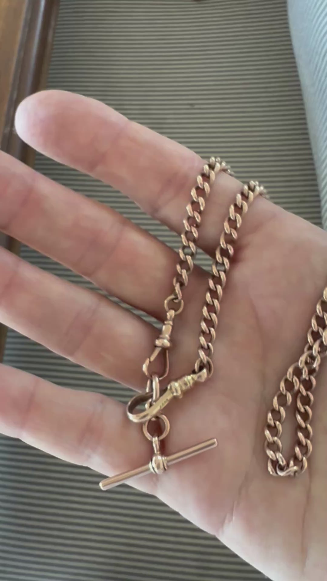This beautiful antique chain has two dog clips that are attached to the fob, which means she can be worn with or without the fob. At least one of the dogclips (or swivels) is a replacement as they are of different sizes. The larger one is most likely a replacement, but I have left her on the chain as she makes it easy to add a pendant, locket or medal, due to her size.