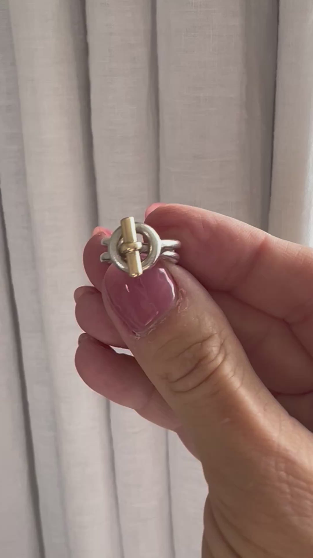This version of the popular Hermes Échappée ring is very unique. It is beautifully made from sterling silver with an 18 carat yellow gold toggle. She is tiny, so probably designed as a pinky ring. The Hermes website says that she was inspired by their "chain d'ancre" range in particular the toggle clasp. Échappée (pronounced e-she-pay) means to escape or breakaway.