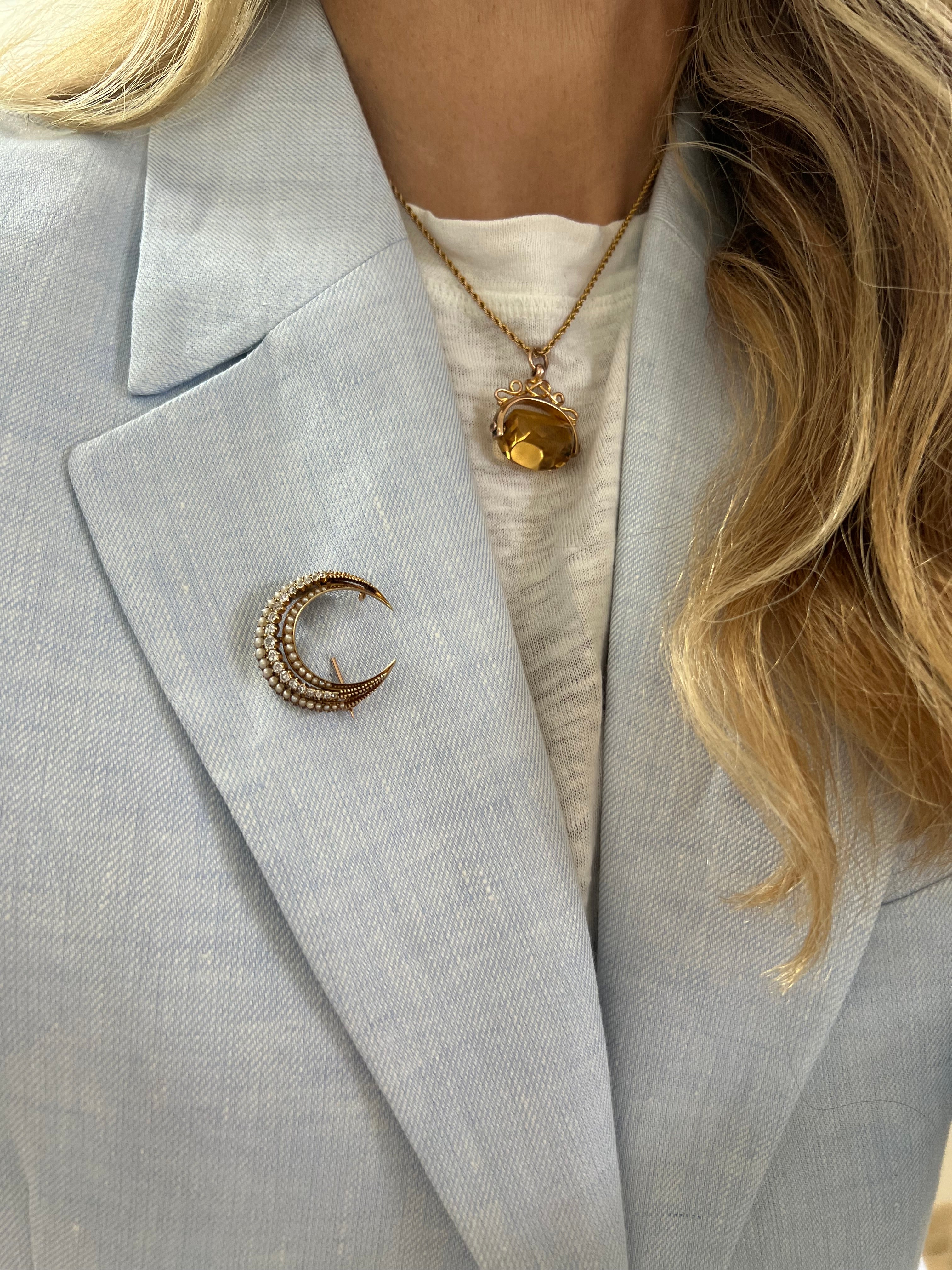An absolutely stunning antique Victorian 15ct yellow gold crescent pendant with diamonds and seed pearls.