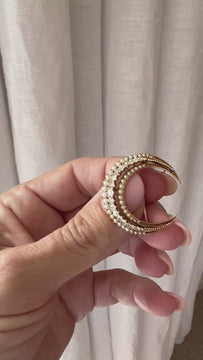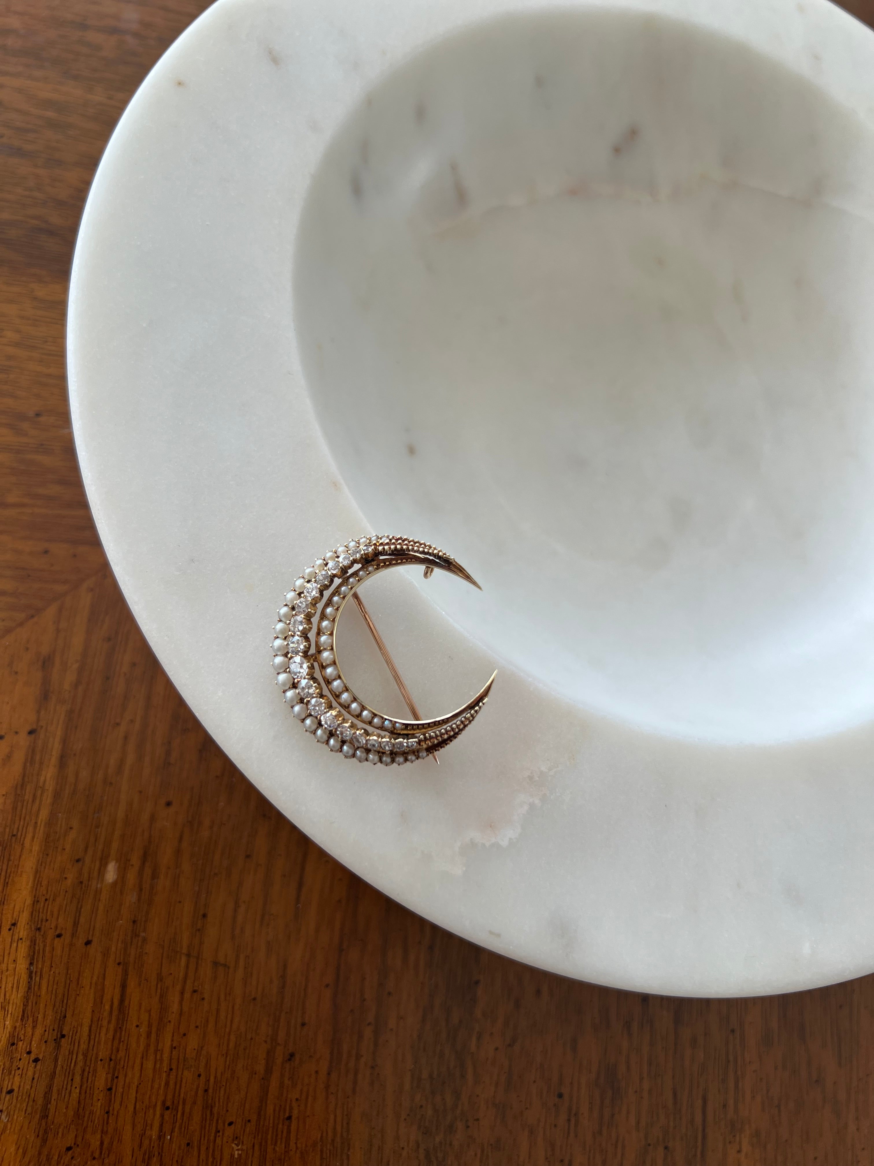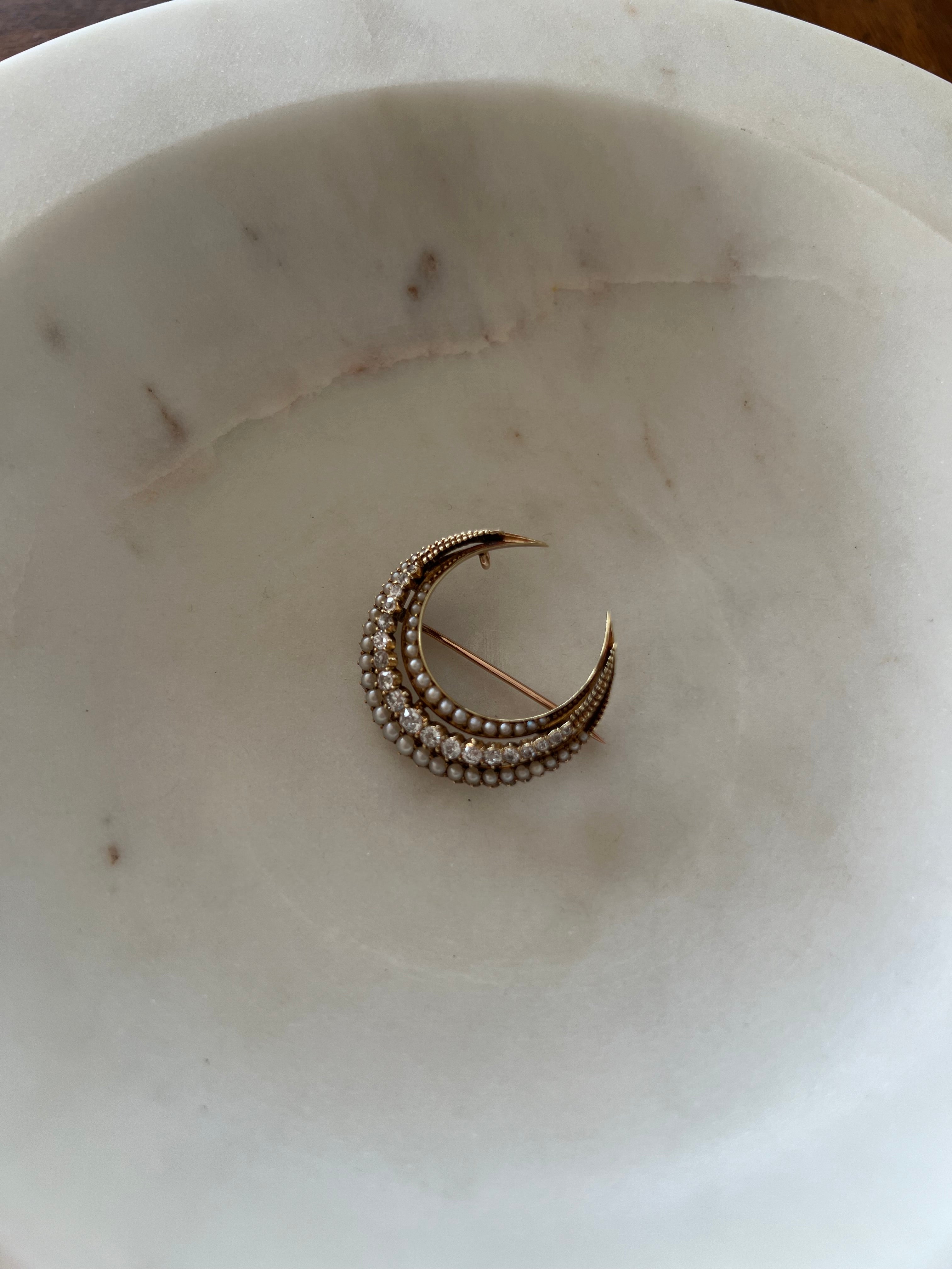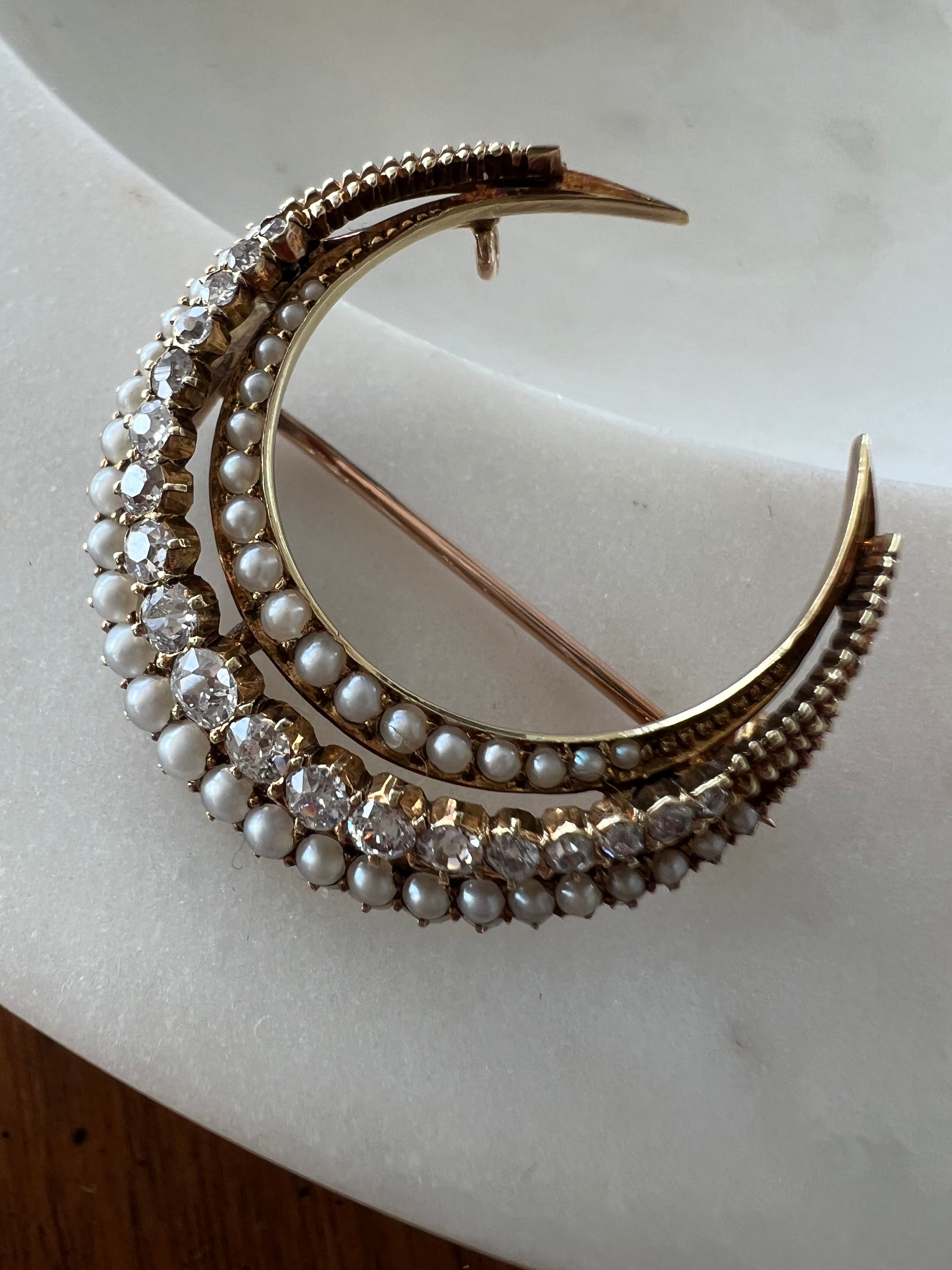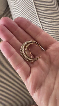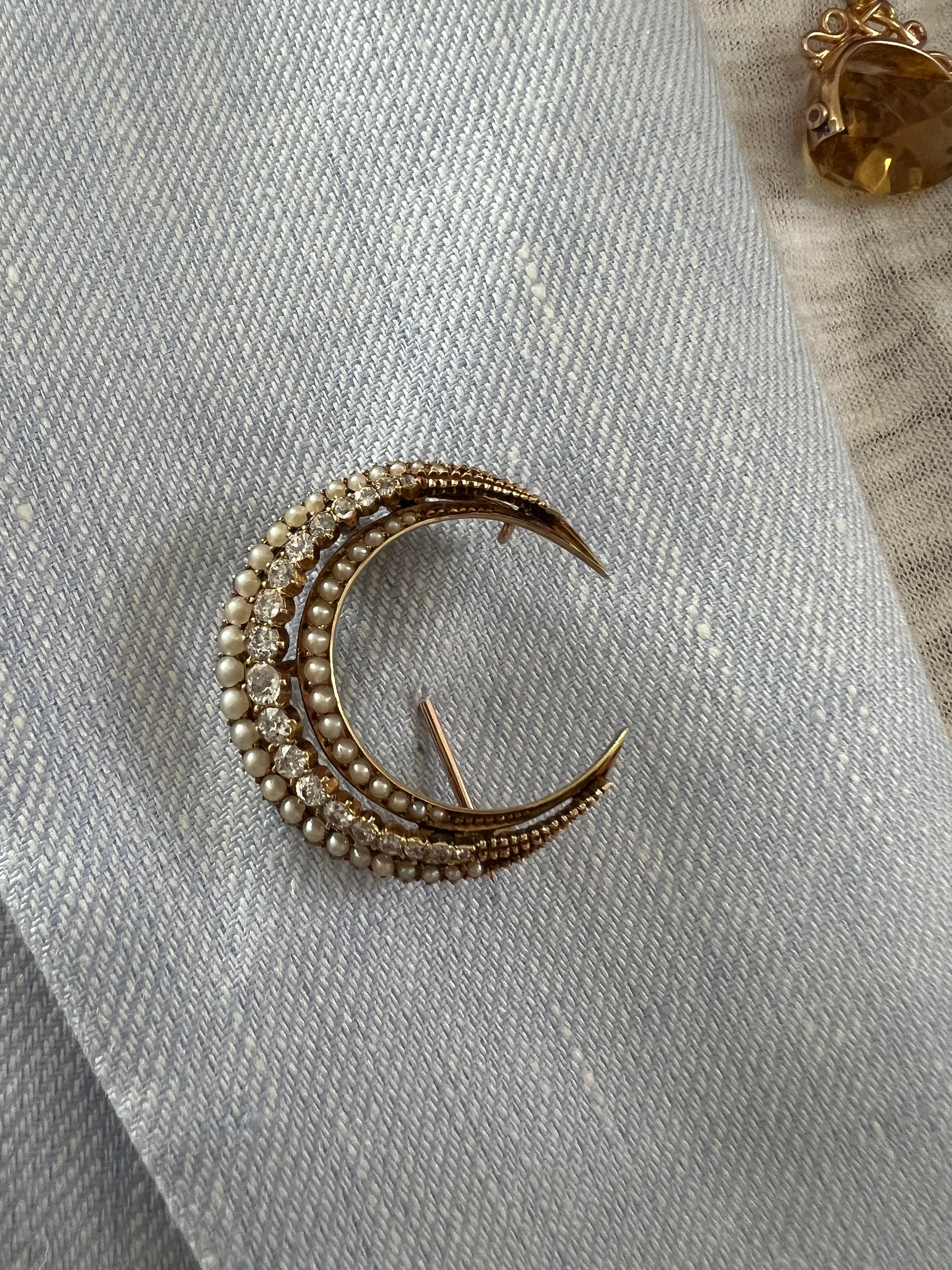 Victorian Seed Pearl & Diamond Crescent Brooch in 15ct Yellow Gold