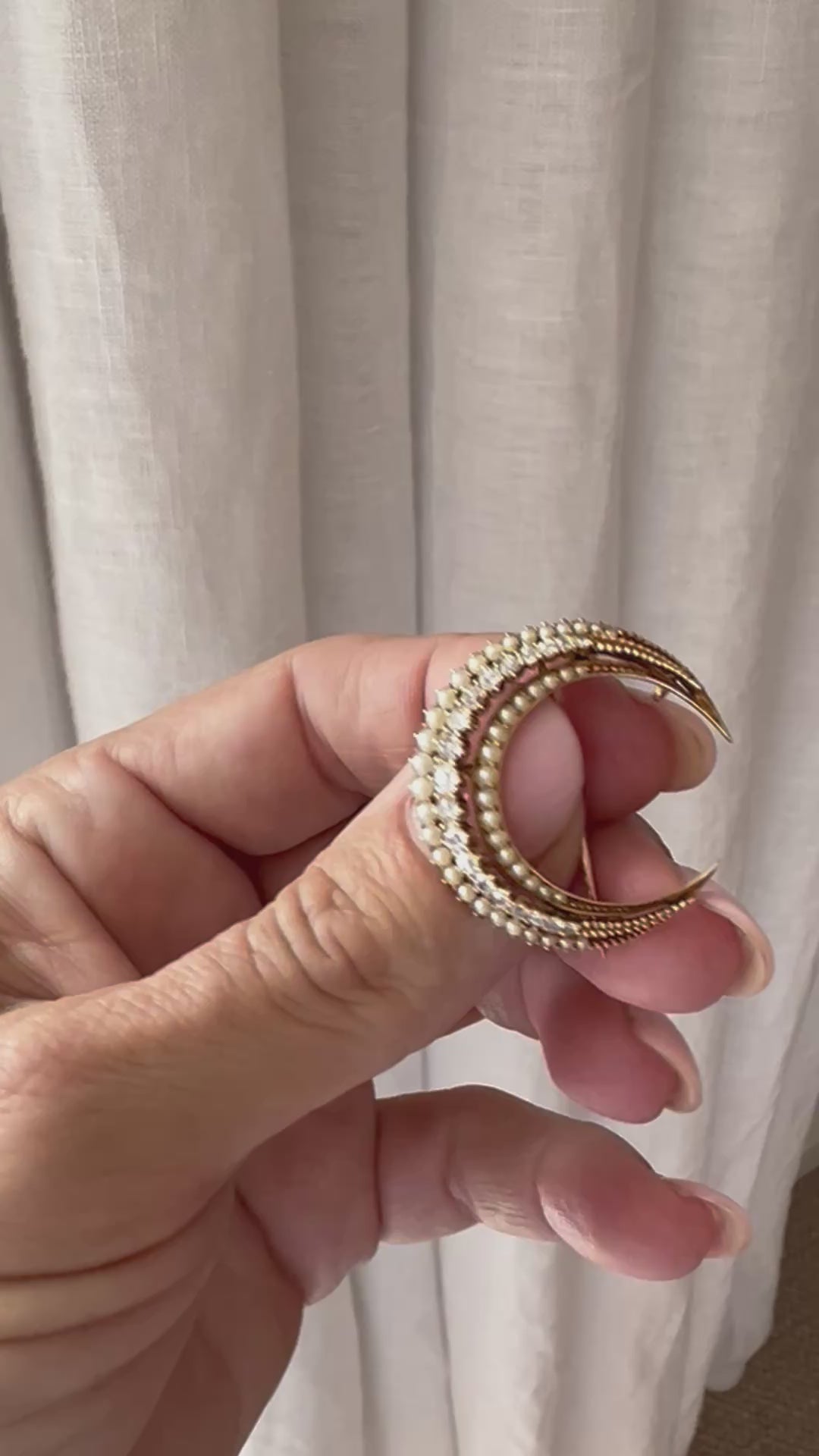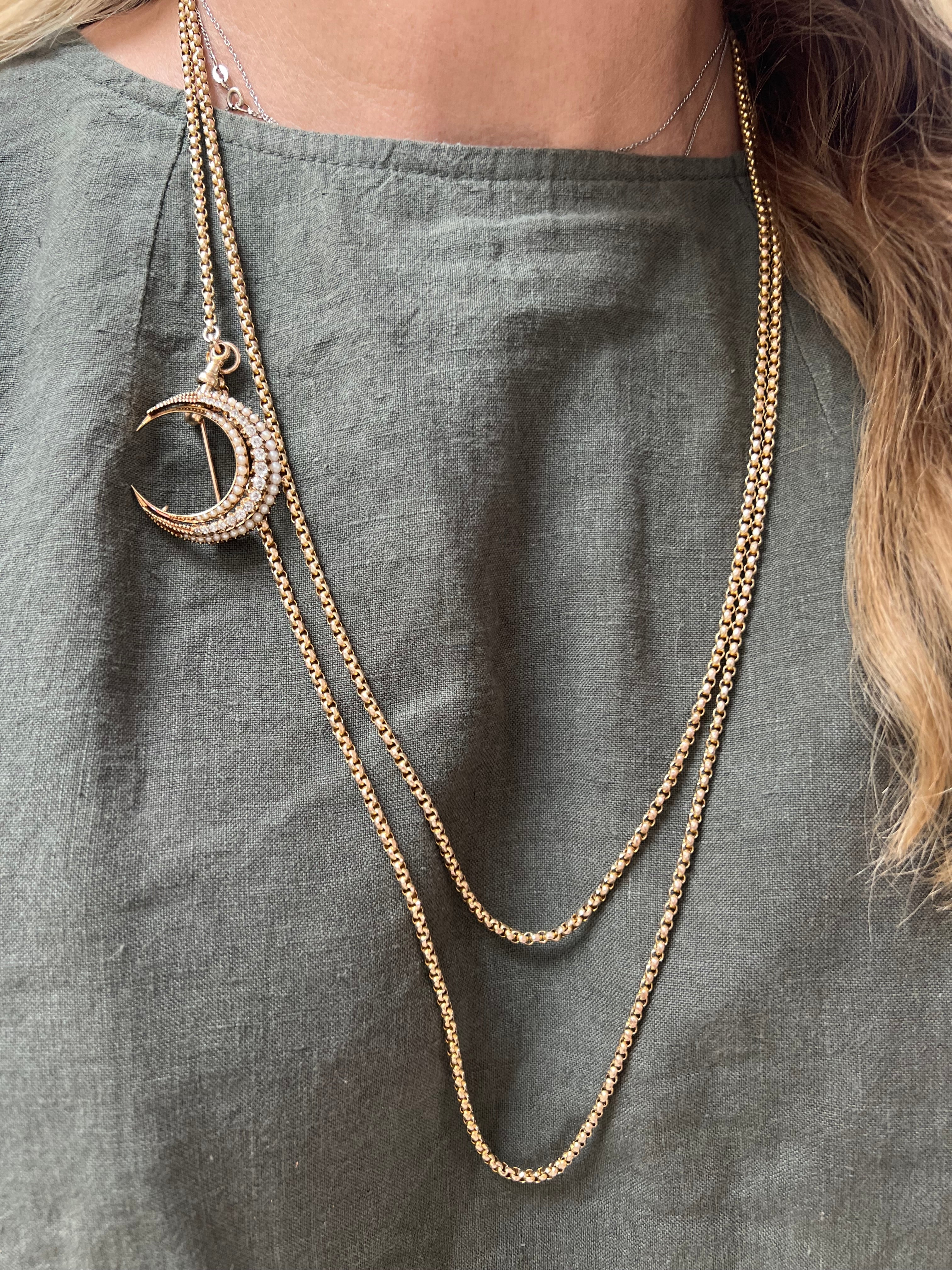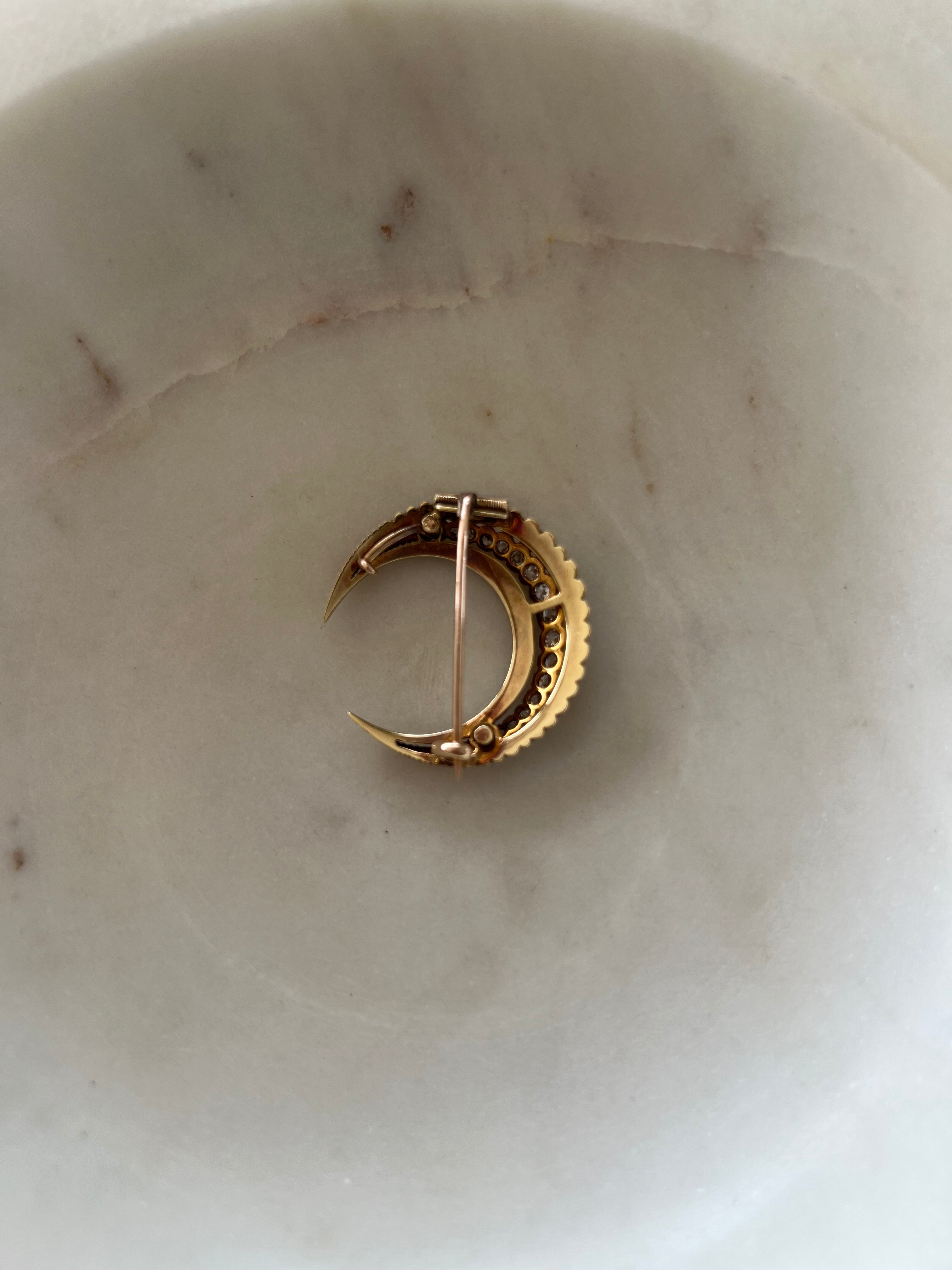 In the shape of a crescent moon, these brooches were typically given as a honeymoon present, the crescent moon was the symbol for Diana the goddess of the Hunt, she was the goddess for among other things fertility, children and childbirth. In more modern times the crescent moon is a symbol of female empowerment. She is most likely English from the late 1800's to early 1900's. She could easily have a loop attached so she could be worn as a pendant.