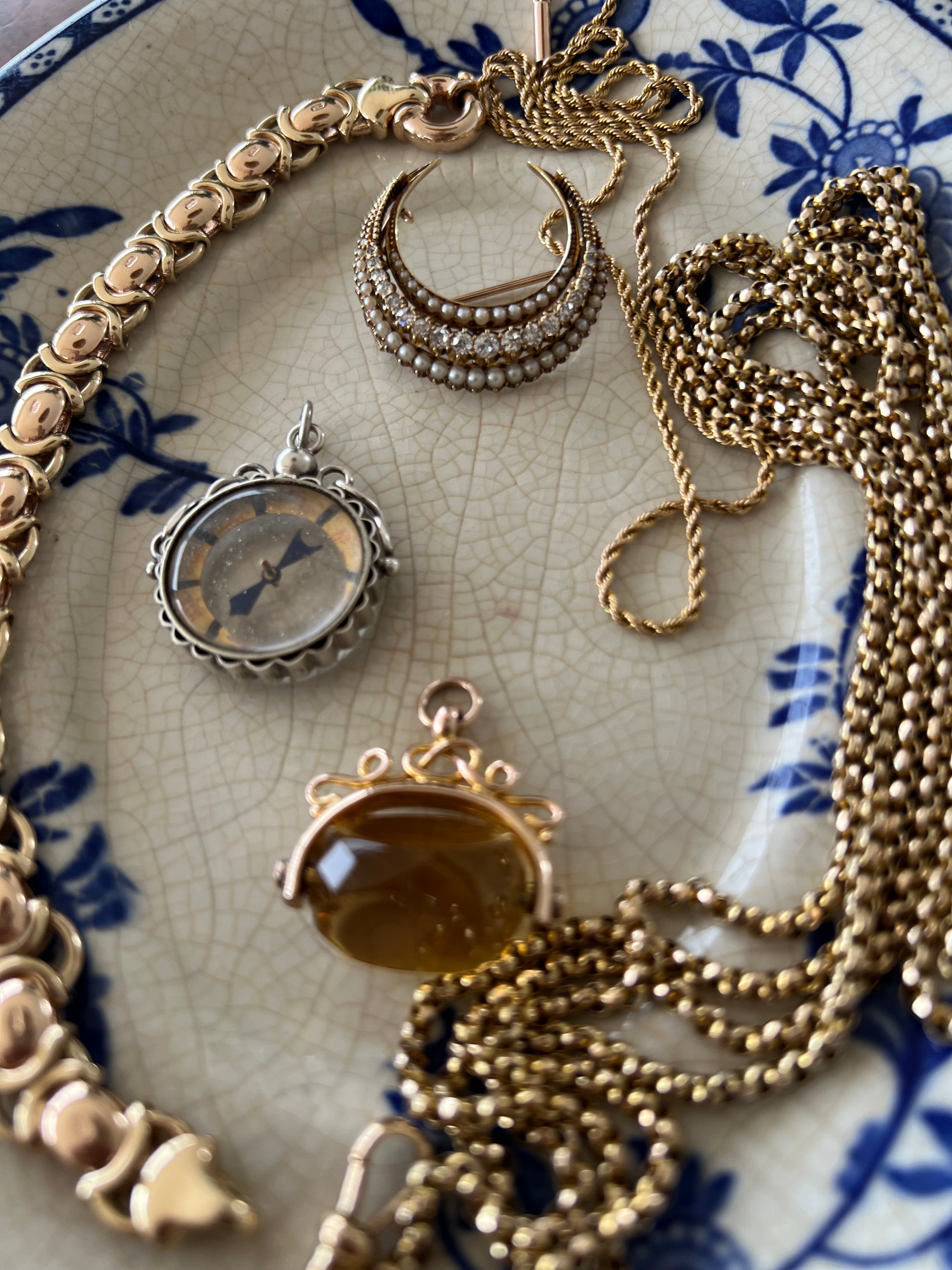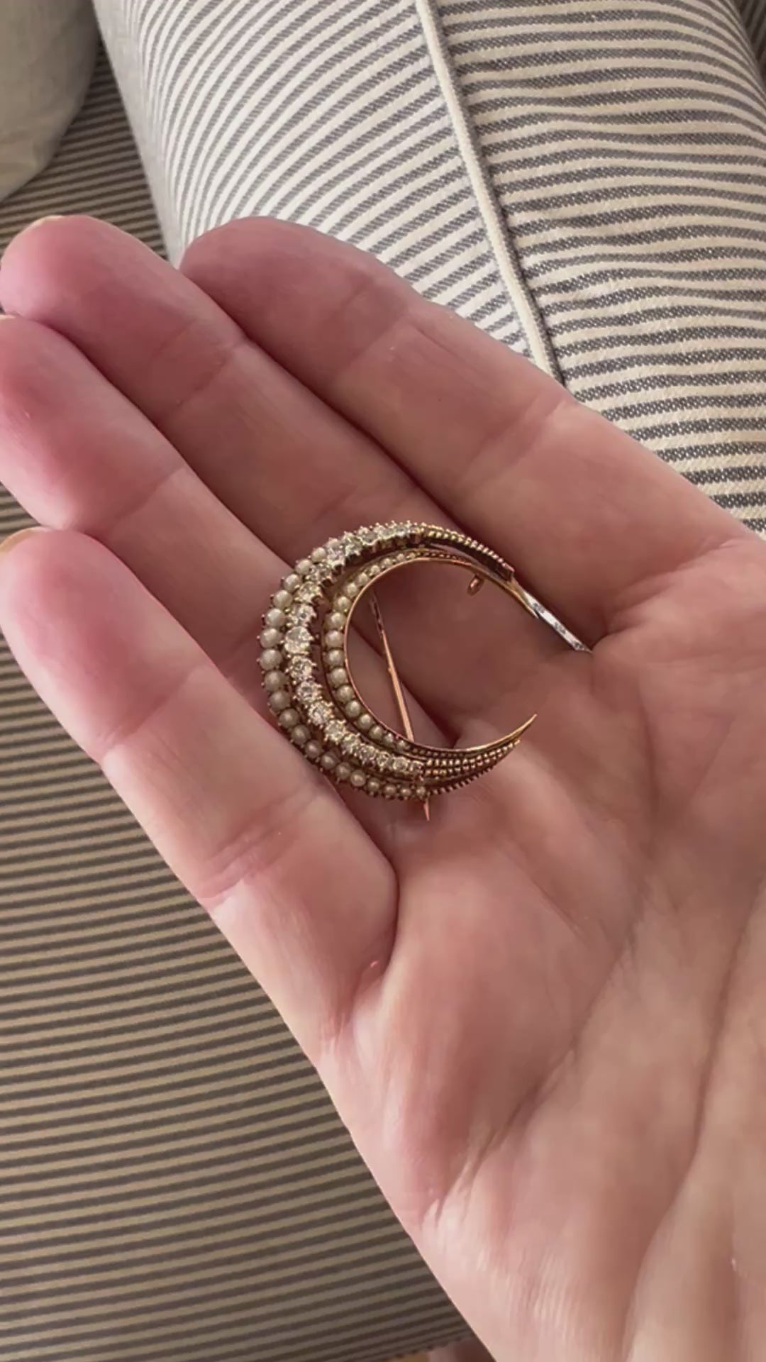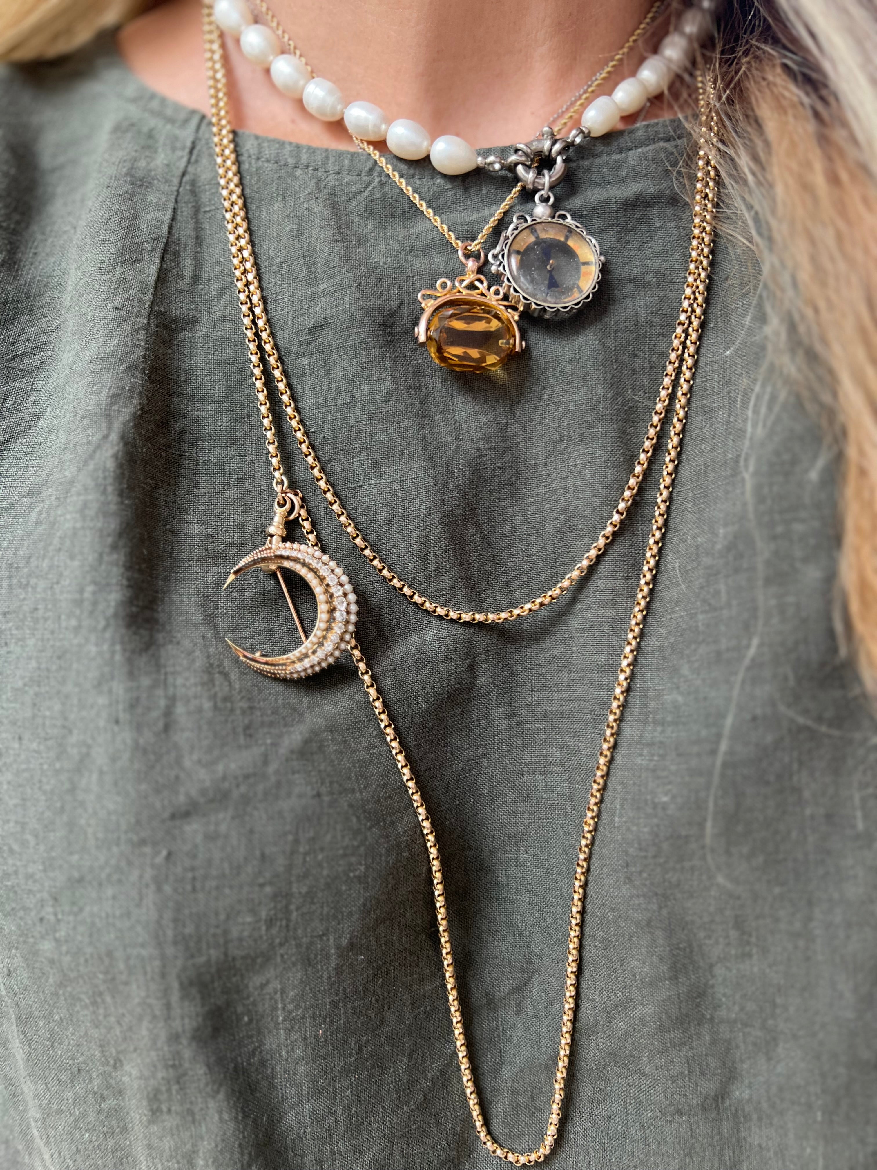 In the shape of a crescent moon, these brooches were typically given as a honeymoon present, the crescent moon was the symbol for Diana the goddess of the Hunt, she was the goddess for among other things fertility, children and childbirth. In more modern times the crescent moon is a symbol of female empowerment. She is most likely English from the late 1800's to early 1900's. She could easily have a loop attached so she could be worn as a pendant.