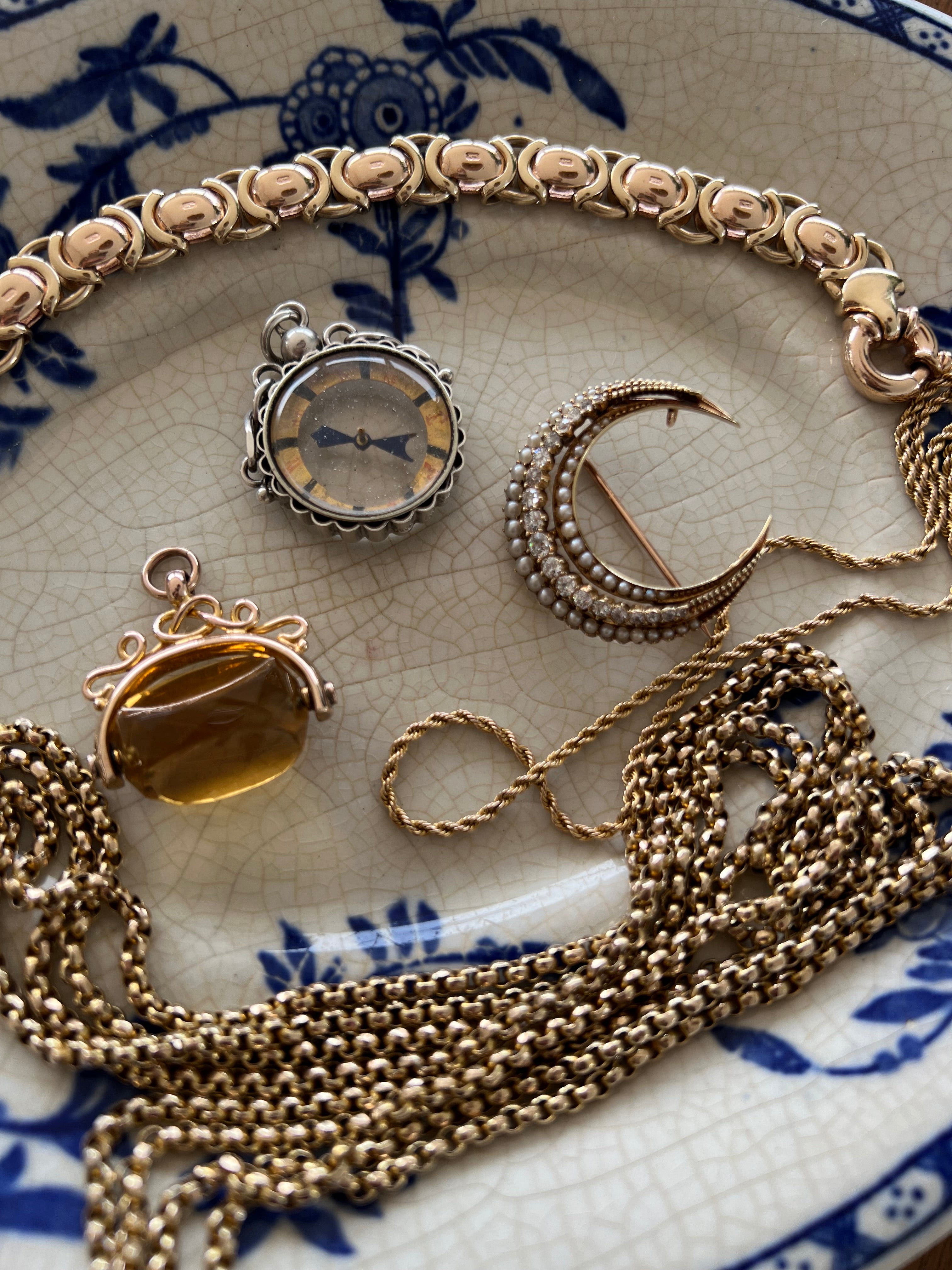 The chain and the dog clip are hallmarked for 9ct gold. The colour is an antique yellow, it actually looks good with both rose and yellow gold, so could be worn with either. She is in excellent antique condition and shows very little sign of wear.