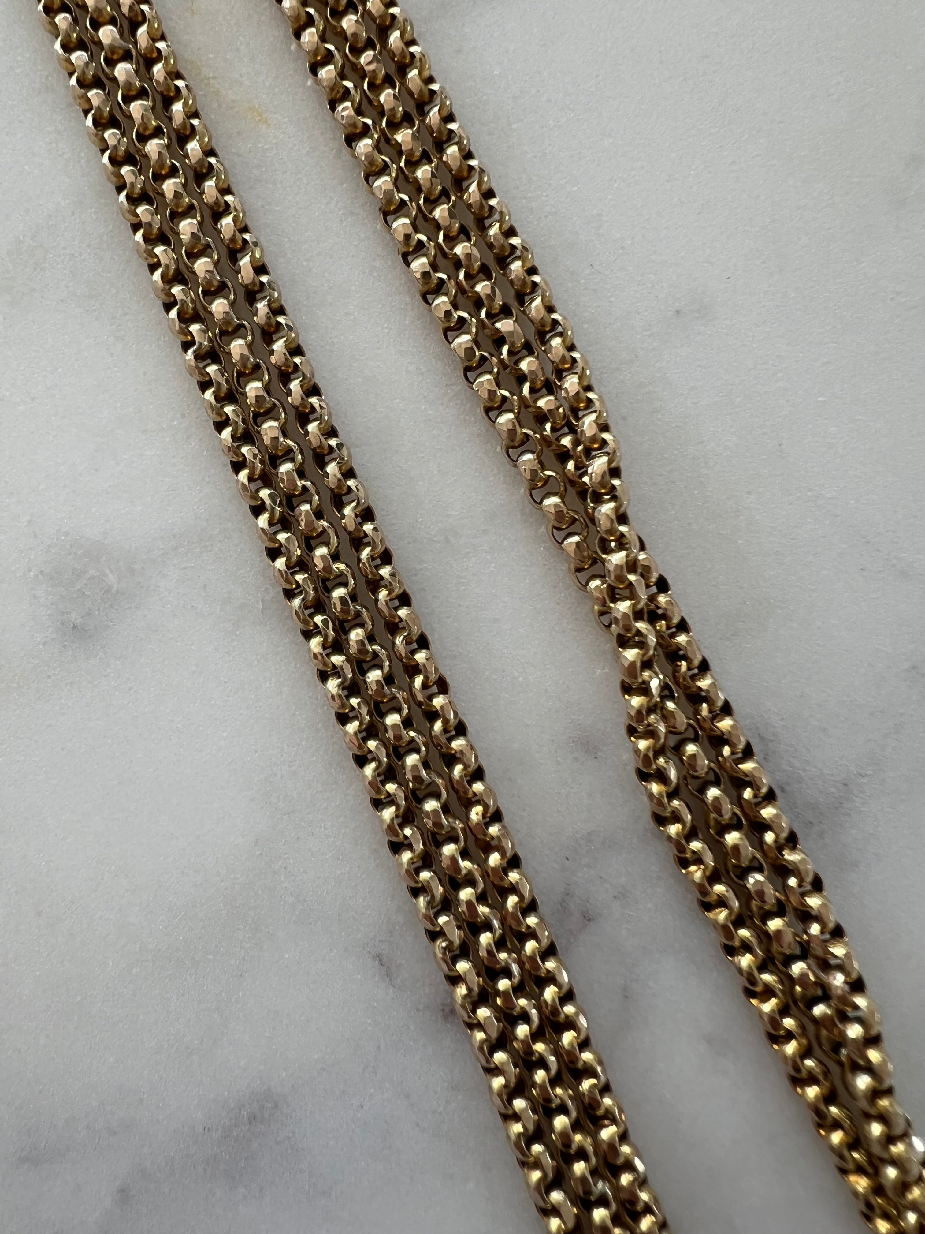 A longuard also known as long guard chains, guard chains, muff chains, lorgnette chains, slide chains, and sautoirs, are very long chains that held a lady's pocket watch, muff, or other similar item.