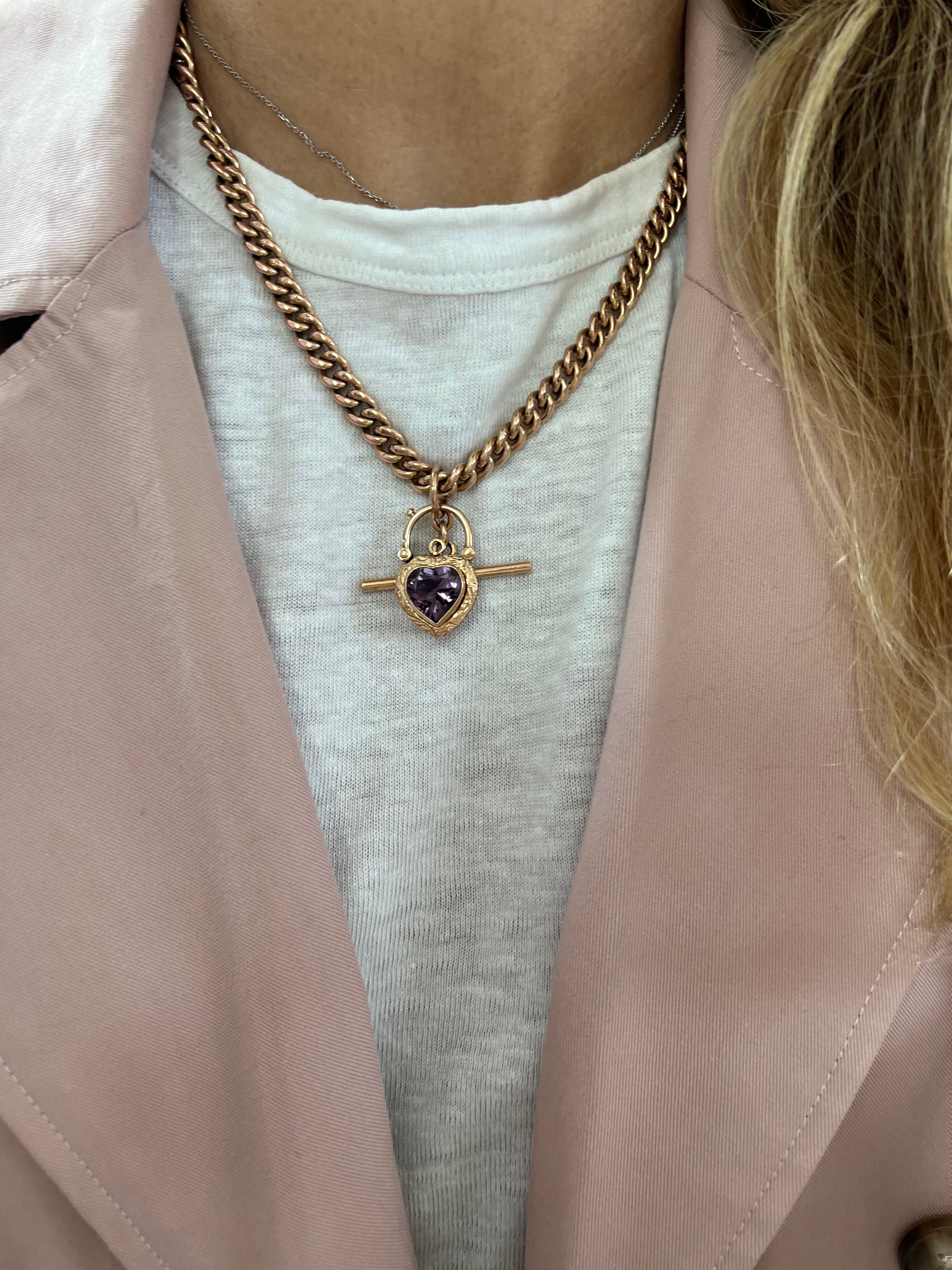 A spectacular heart shaped padlock fashioned in 9ct rose gold with a stunning heart shape brilliant cut amethyst.