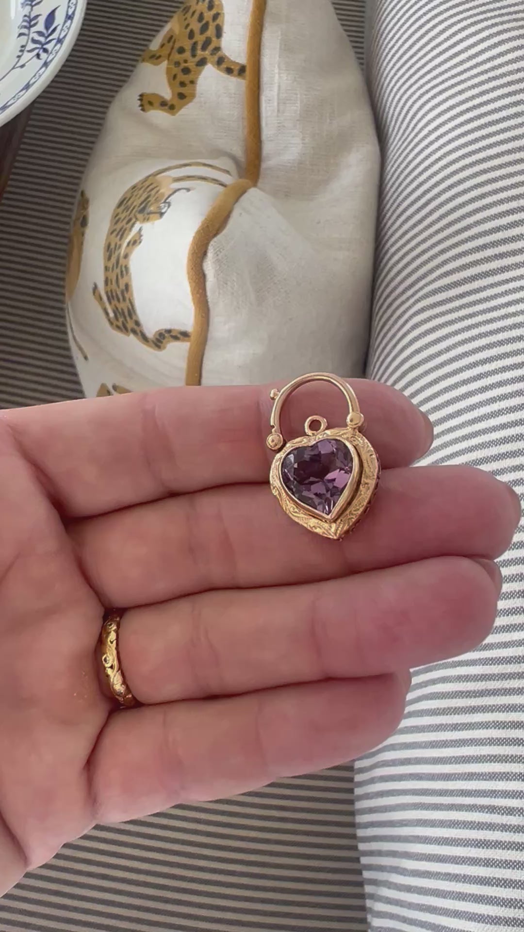 This beauty is a very well made heart shaped padlock, she has the most stunning amethyst bezel set in her centre with lovely engraving surrounding her. The sides and back of the padlock have beautiful fillagree work, she could be worn with either the back or front showing.