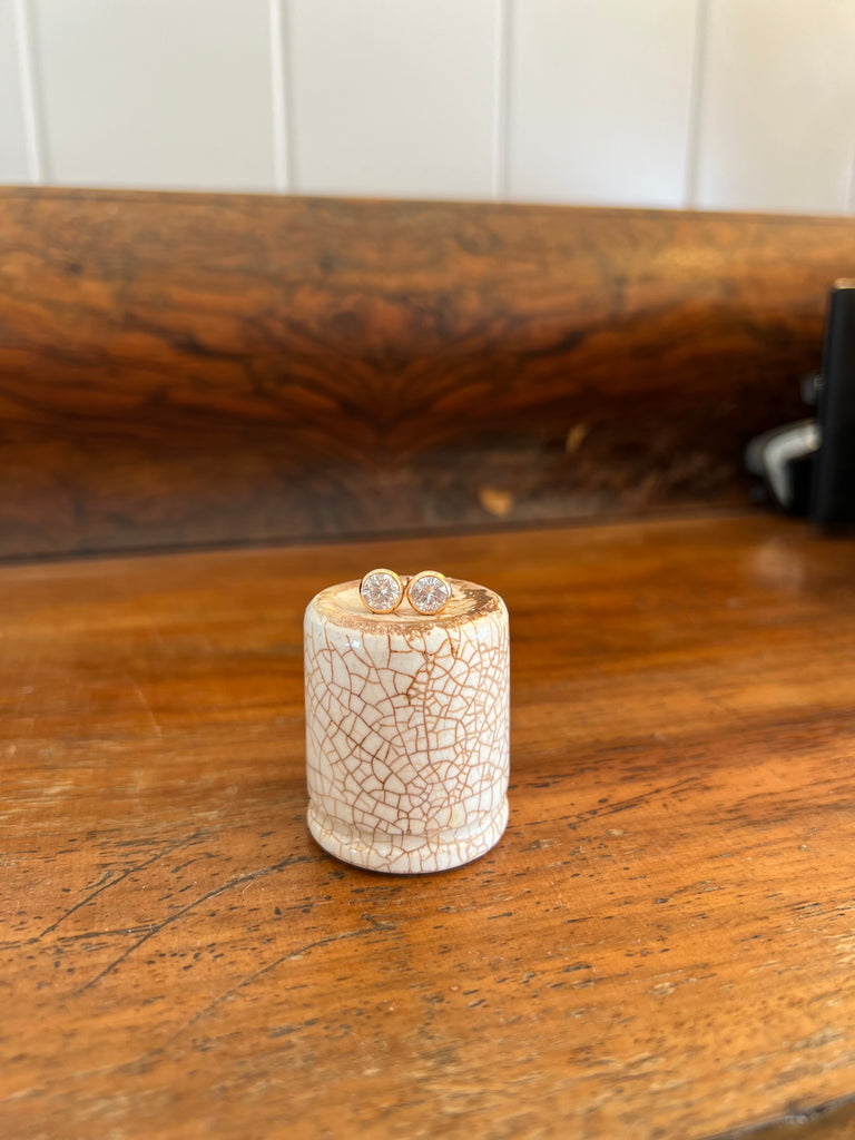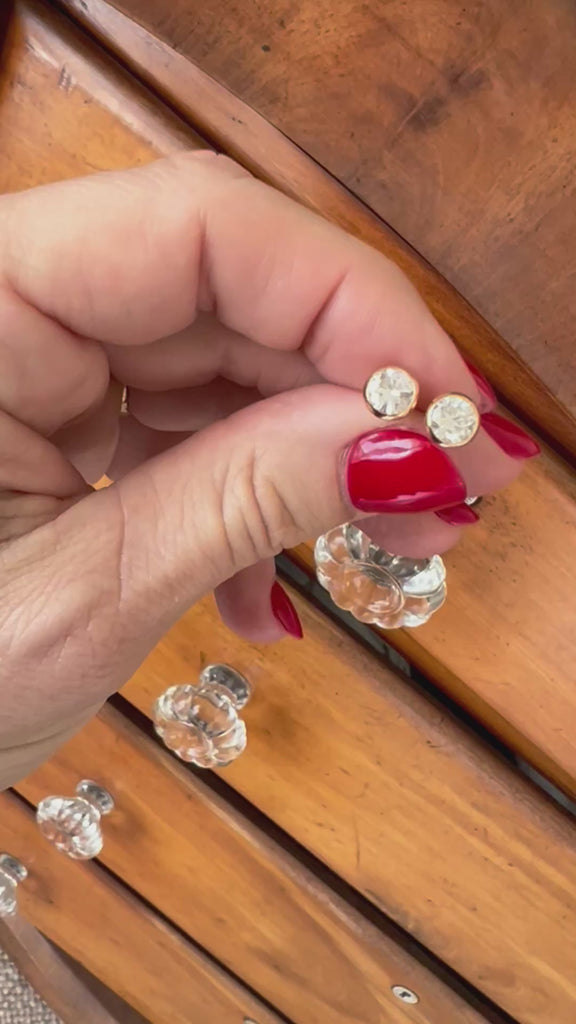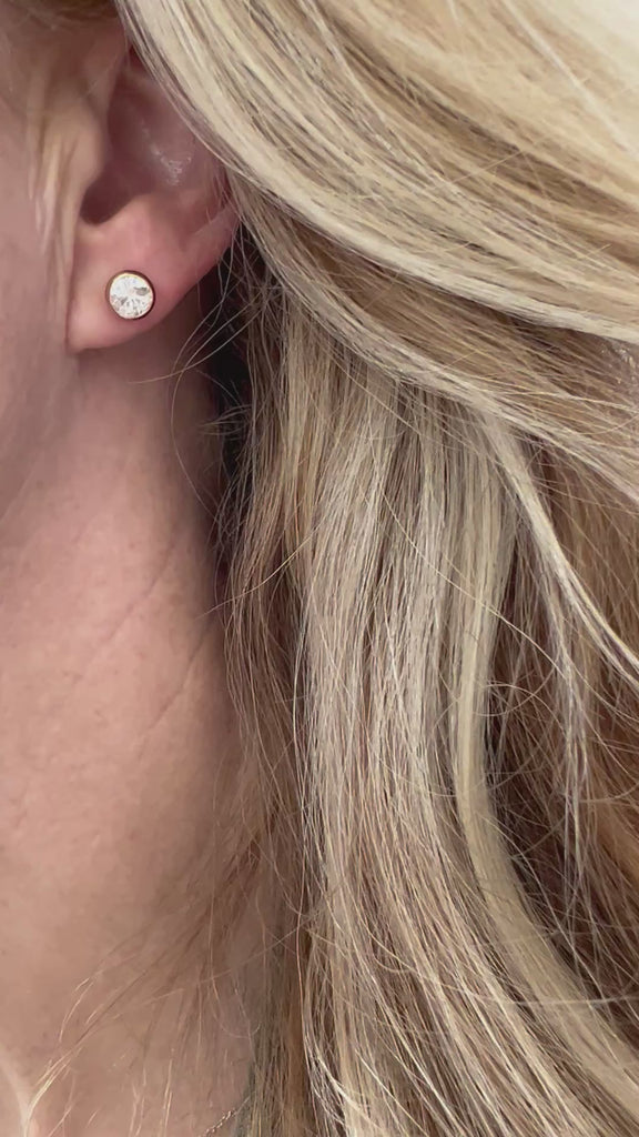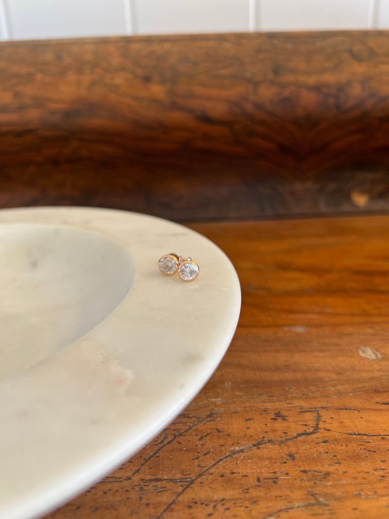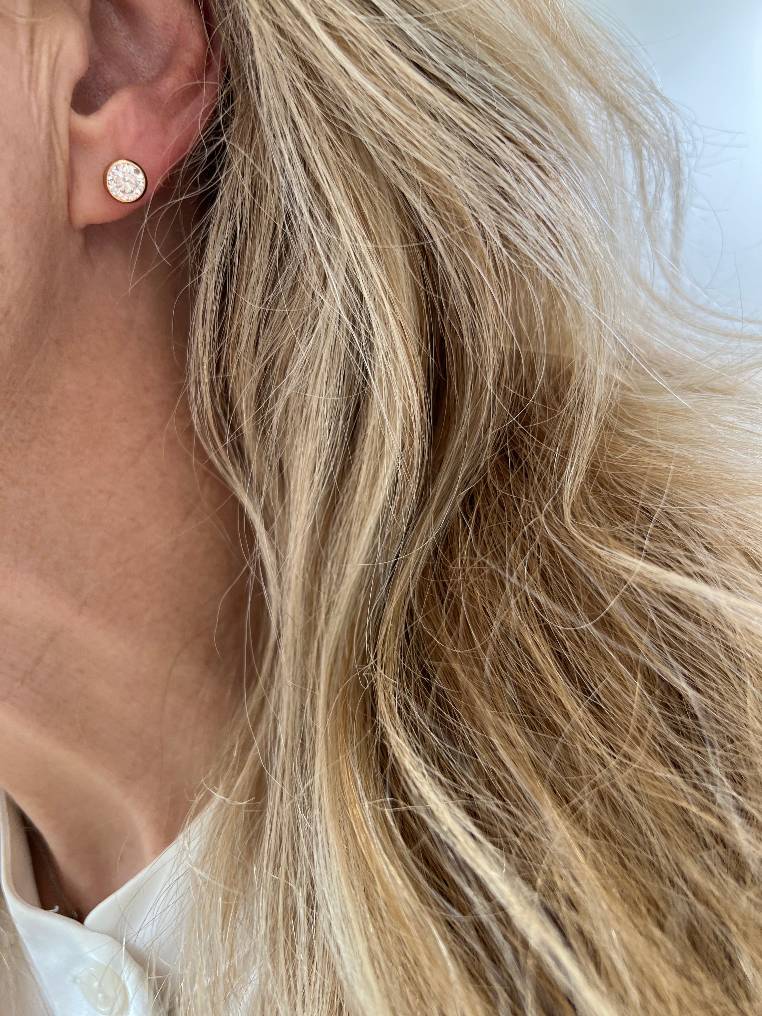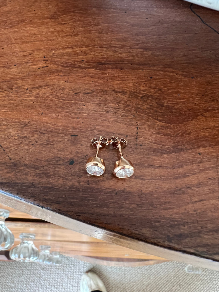 What an amazing pair of classic stud earrings. Quite a statement! Each earring has a 1 carat diamond, bezel set in 9ct rose gold, which is quite unusual, but beautiful. The diamonds face up with a little bit of warmth, it's hard to tell if this is the diamond colour or from the setting, one diamond has one eye visible inclusion and the other has two, but these are not noticeable when worn, and they have been priced accordingly.