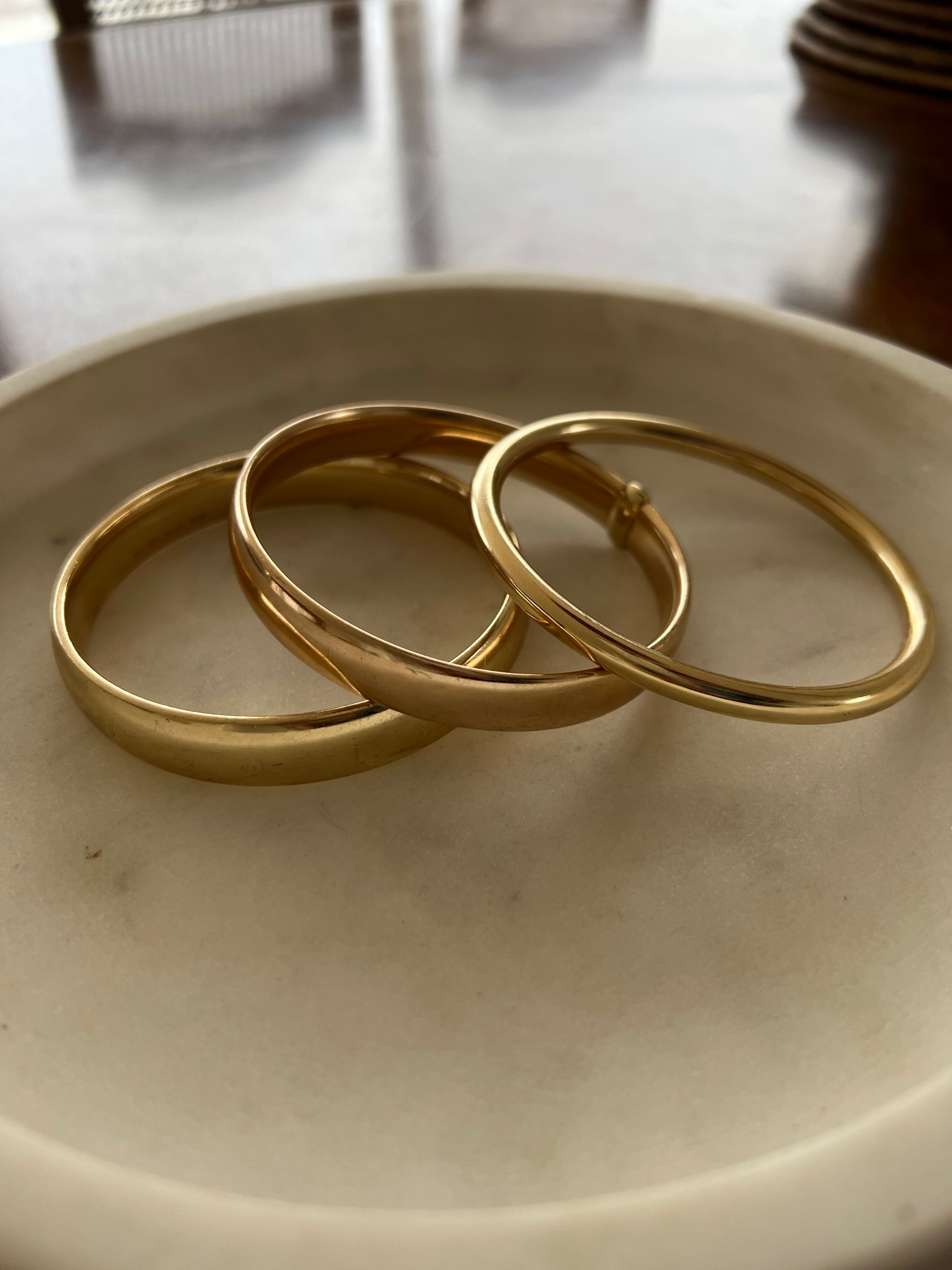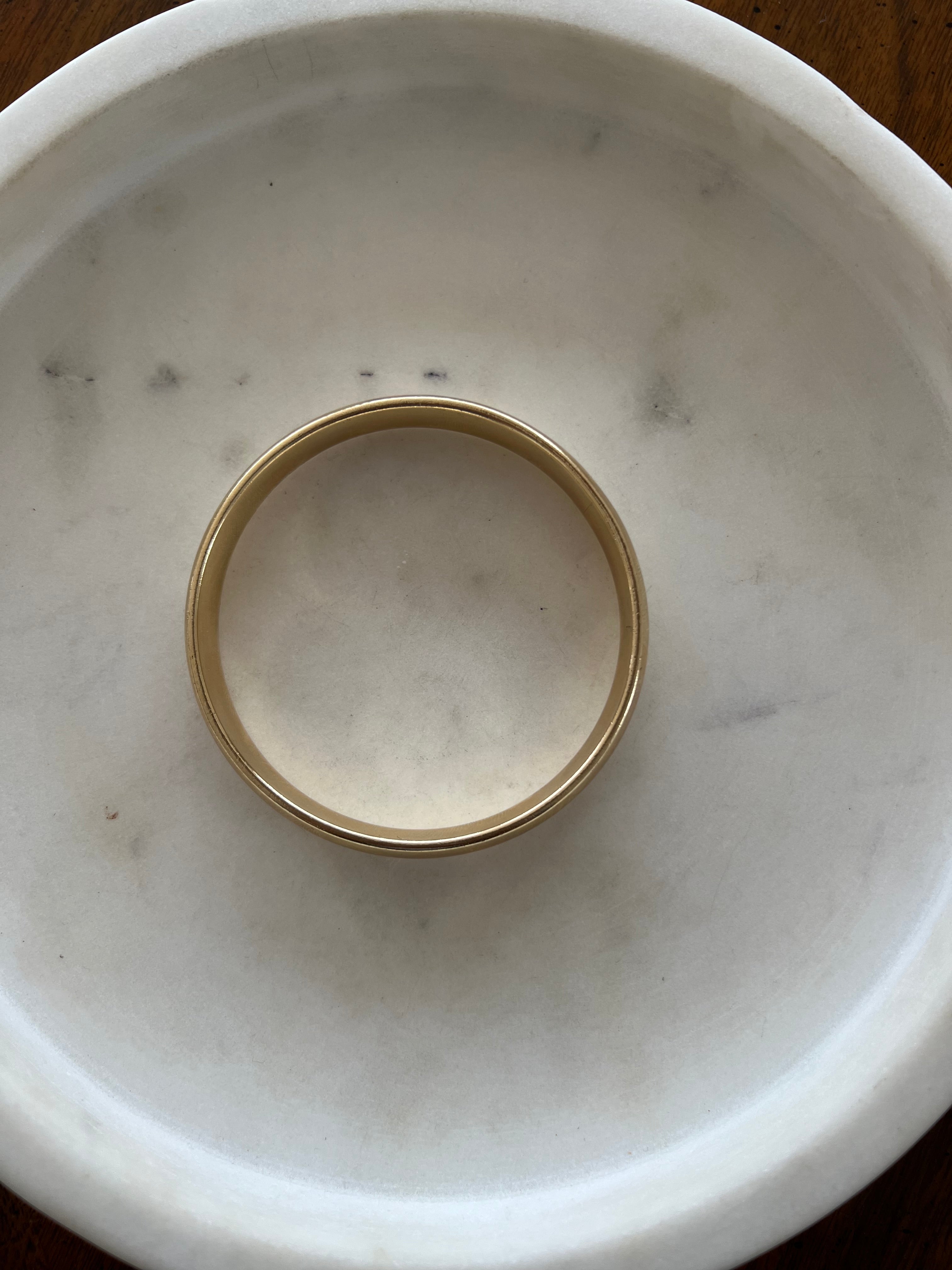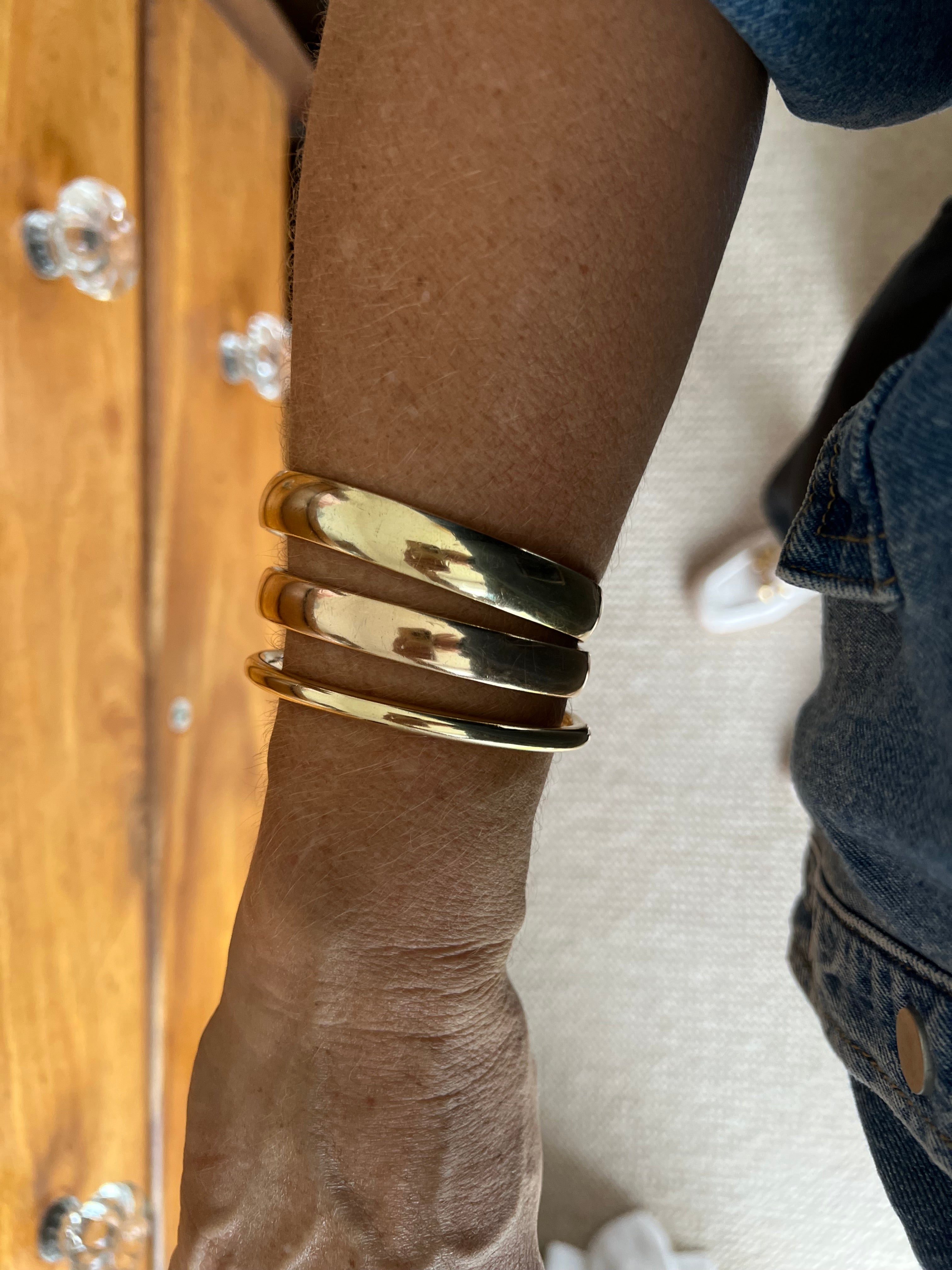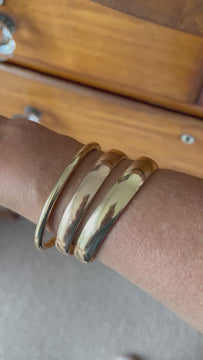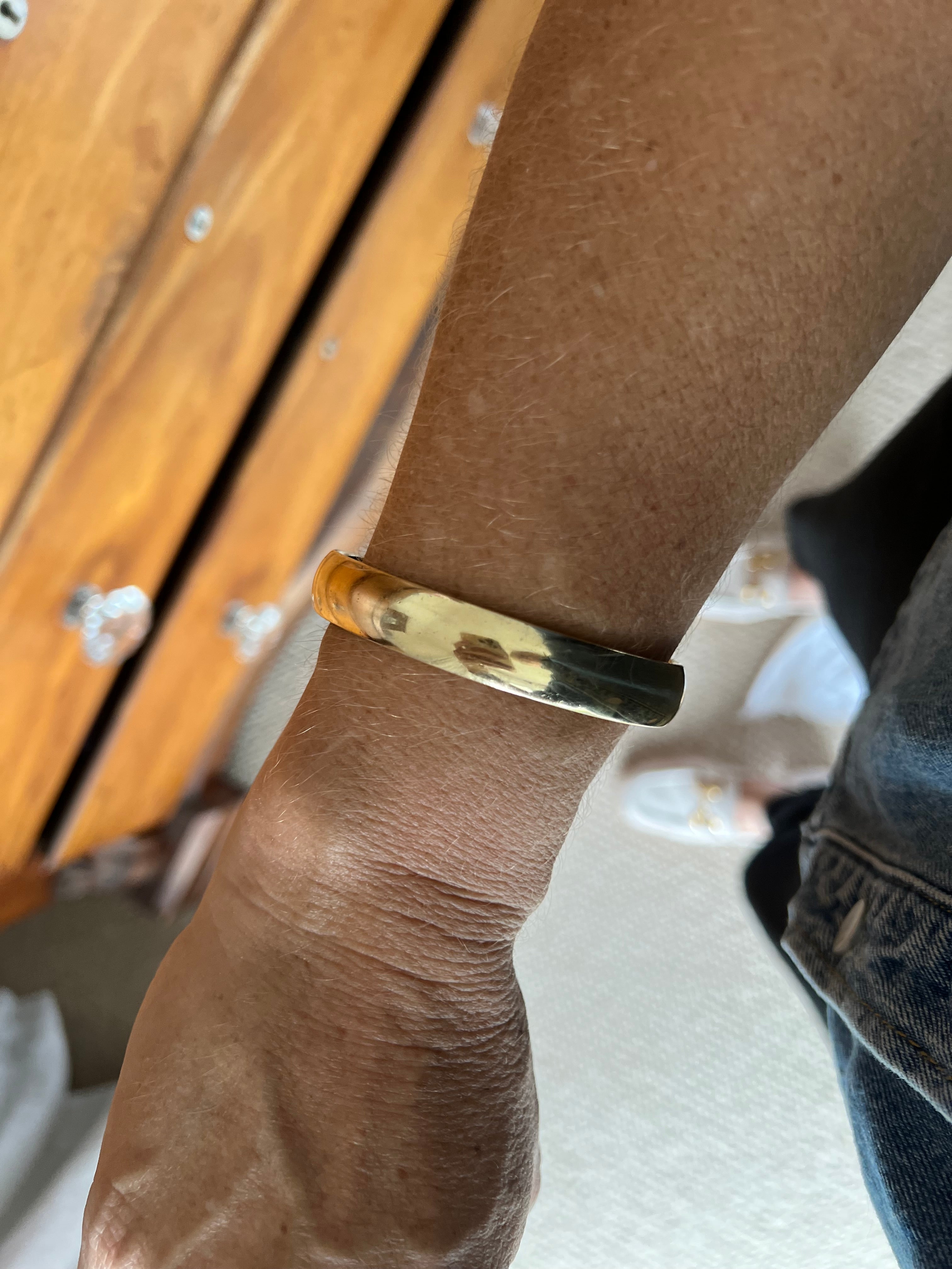 This bangle has been made in 9ct yellow gold and has then been silver filled. This prevents her denting as hollow bracelets do. It weighs a very impressive 91 grams and has the most beautiful golden glow. She is in good vintage condition, she has some minor surface scratches but no dents. I have had her polished by my jeweller.