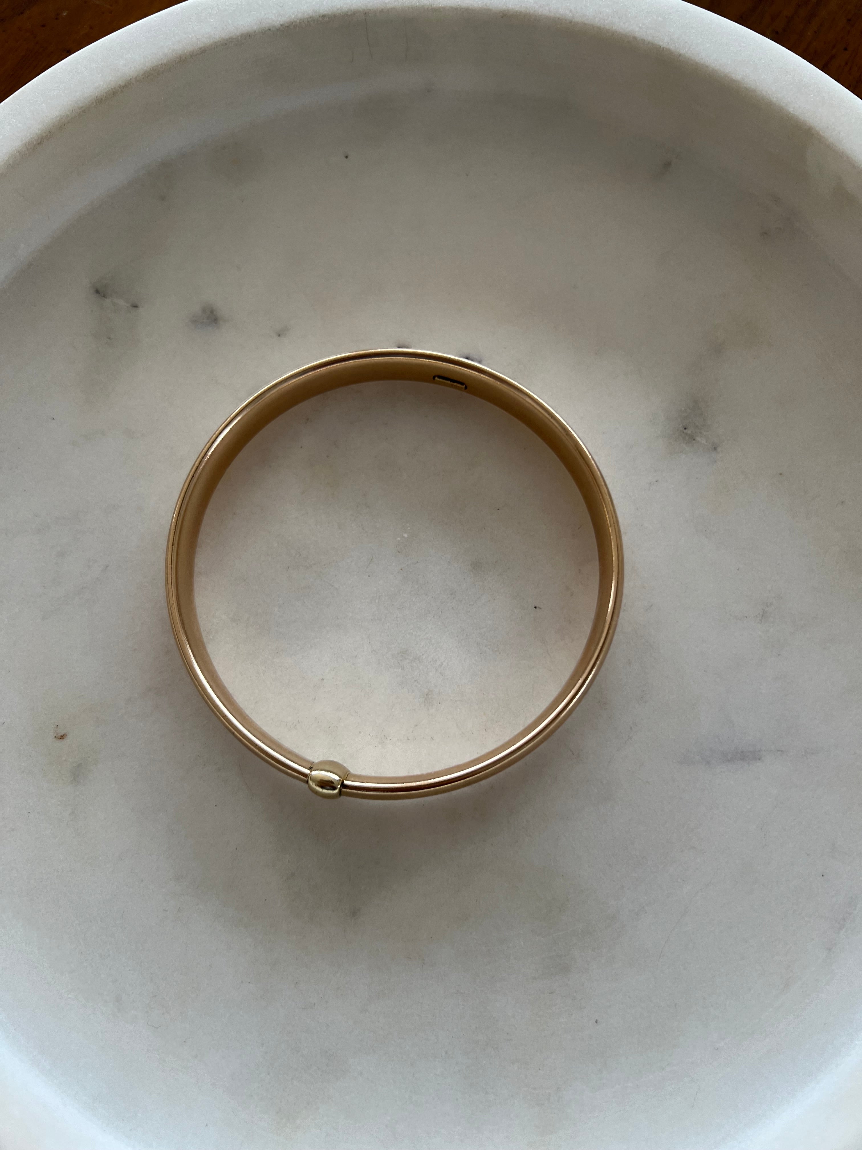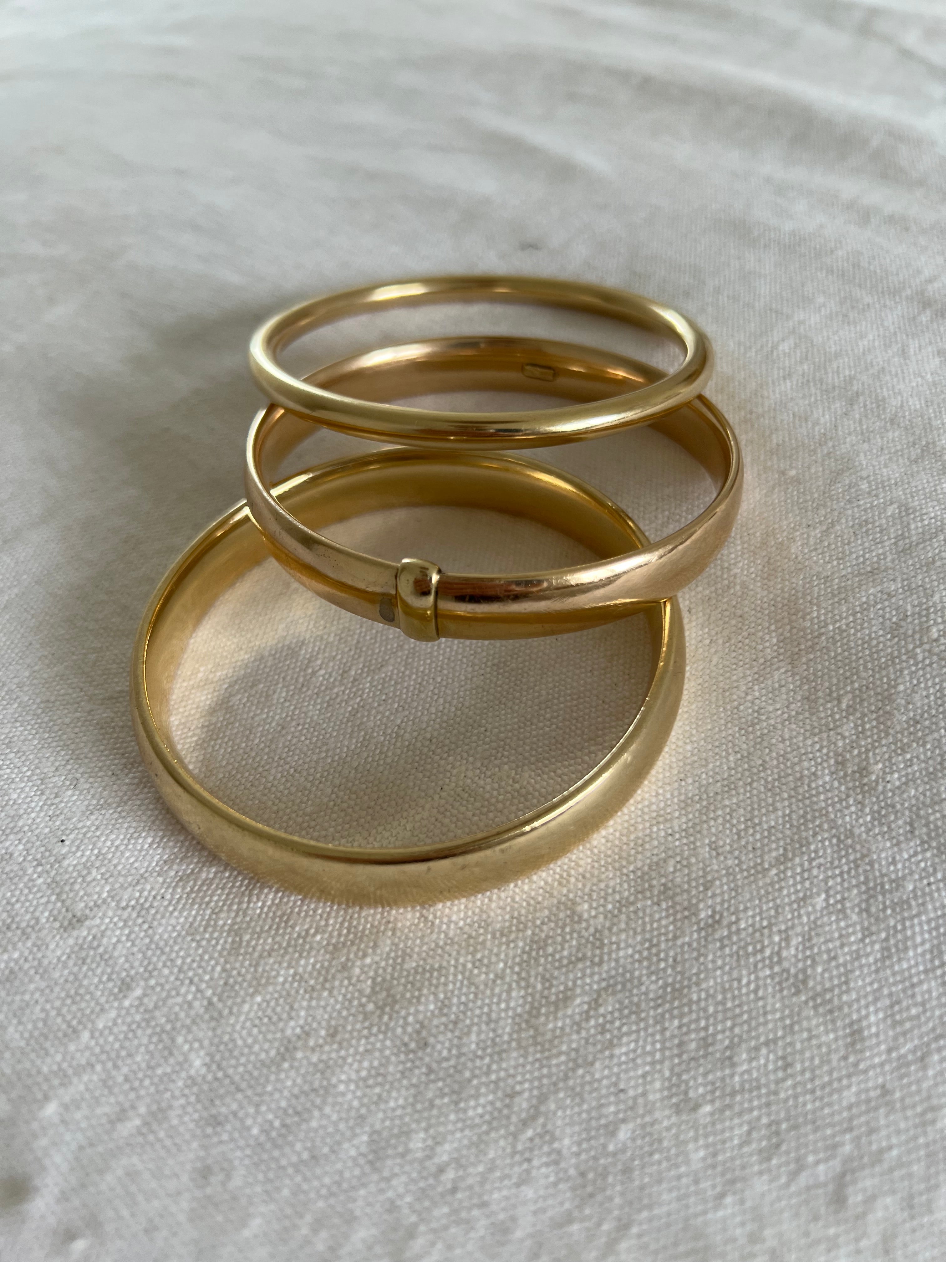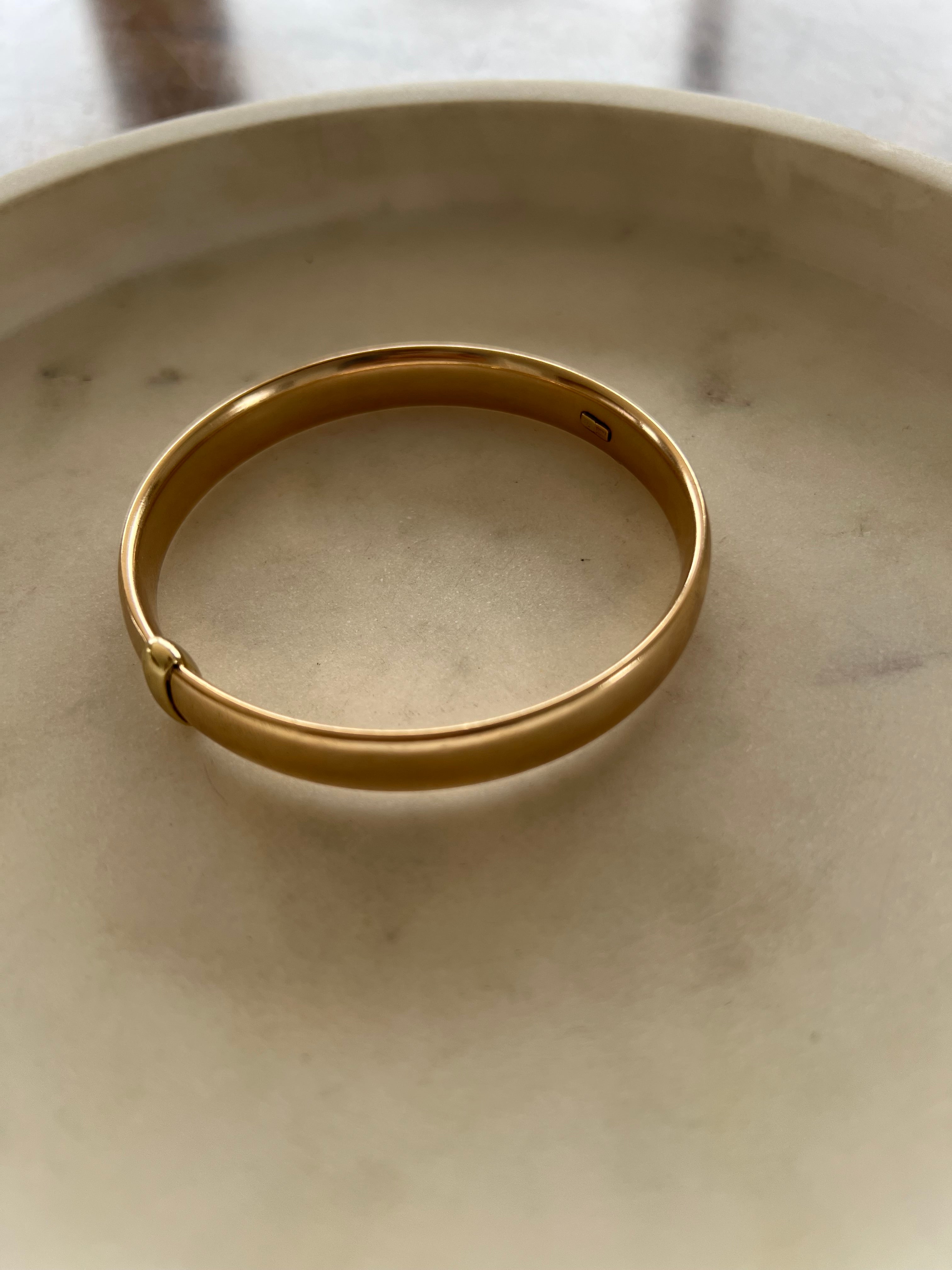 Classic 9ct yellow gold, silver filled, comfort fit bangle. In very good condition, this looks beautiful stacked with both antique and modern pieces. It is a modern piece.
