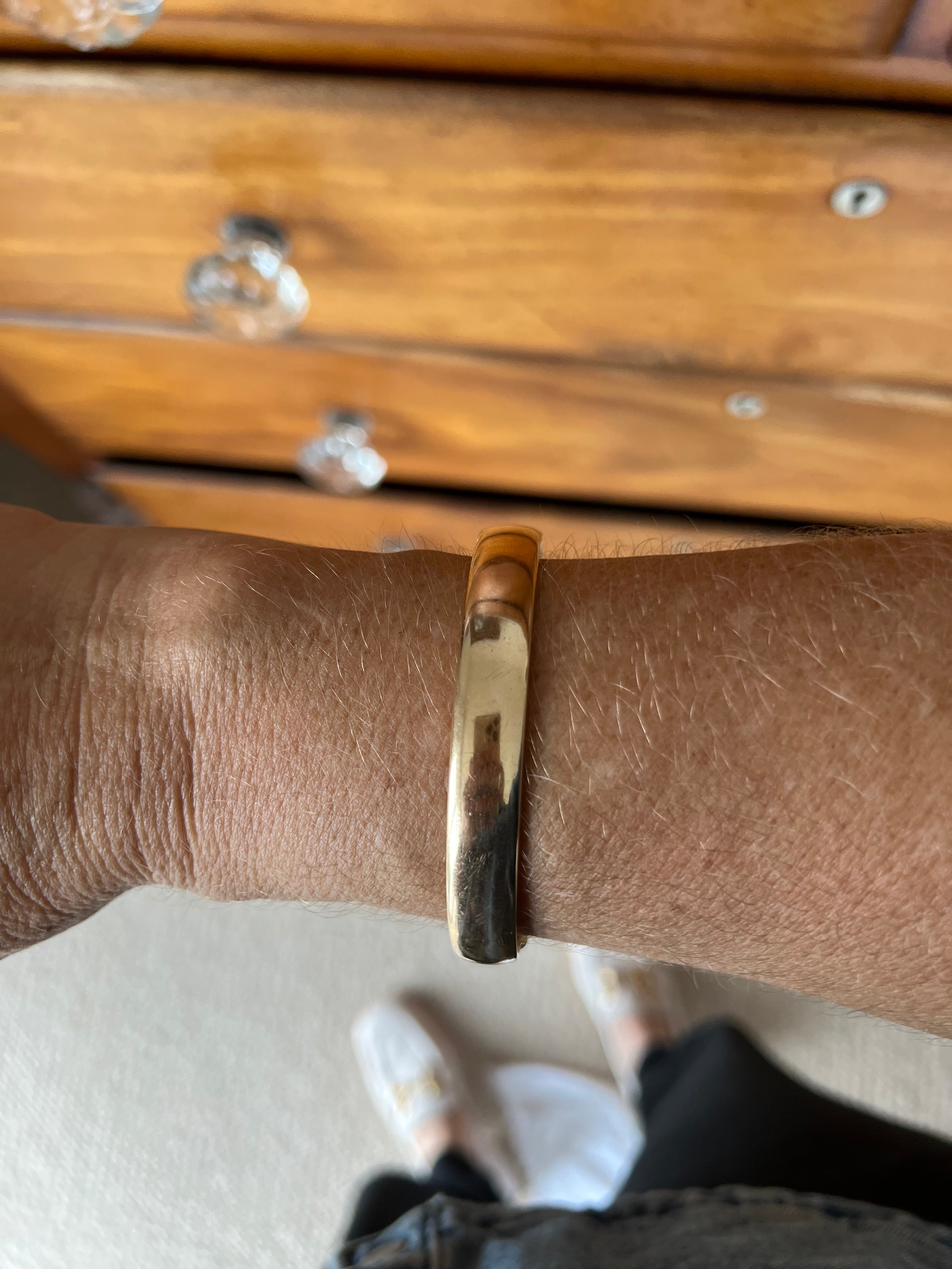 This bangle has been made in 9ct yellow gold and has then been silver filled. This prevents her denting as hollow bracelets do. She has the most beautiful colour, almost rosy, she could be worn with yellow or rose gold. She is in good vintage condition, she has some minor surface scratches and one small discoloured mark, just near the raised section, possibly caused by wear, but this really is unnoticeable when worn. I have had her polished by my jeweller.