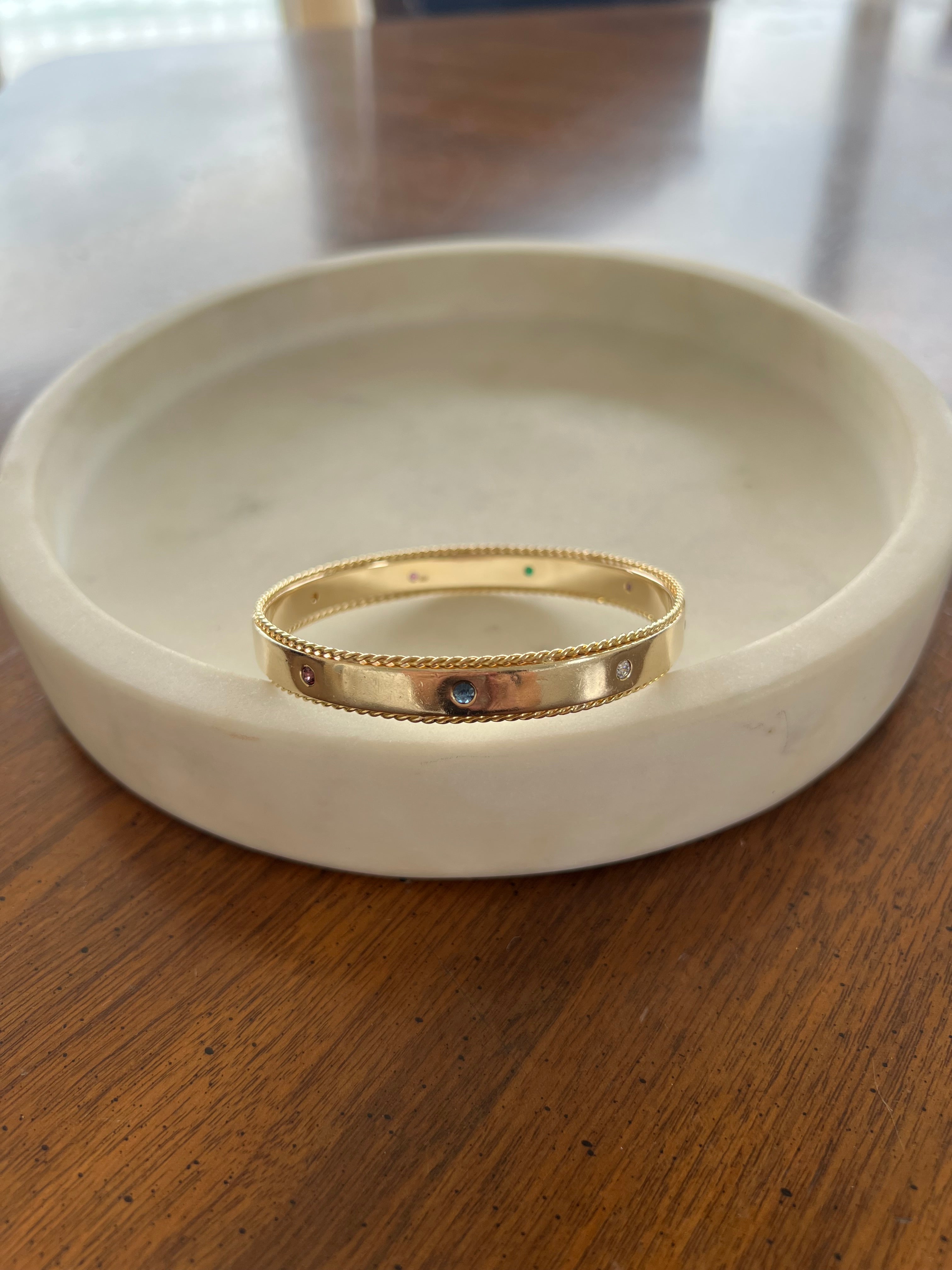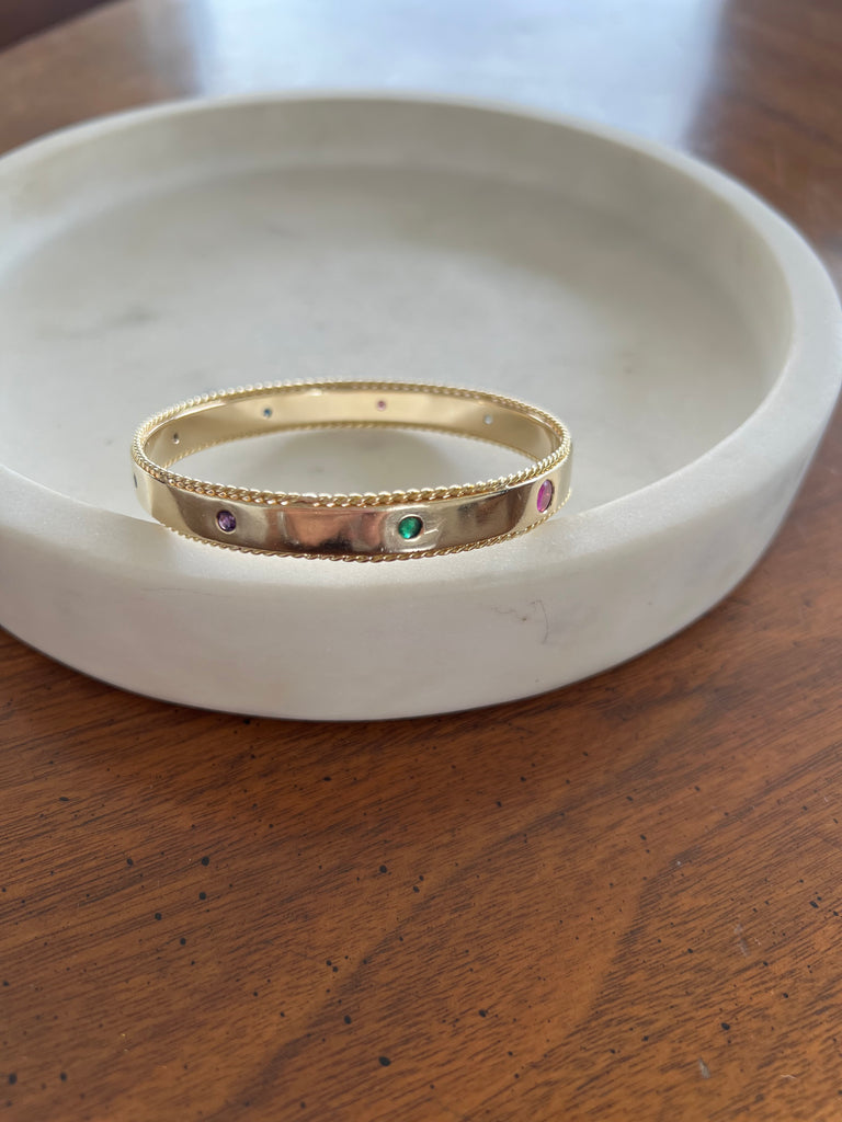 Absolutely stunning, custom made, 9ct yellow gold bangle, gypsy set with a diamond, emerald, garnet, amethyst, ruby, citrine, aquamarine, pink tourmaline and a blue sapphire.
