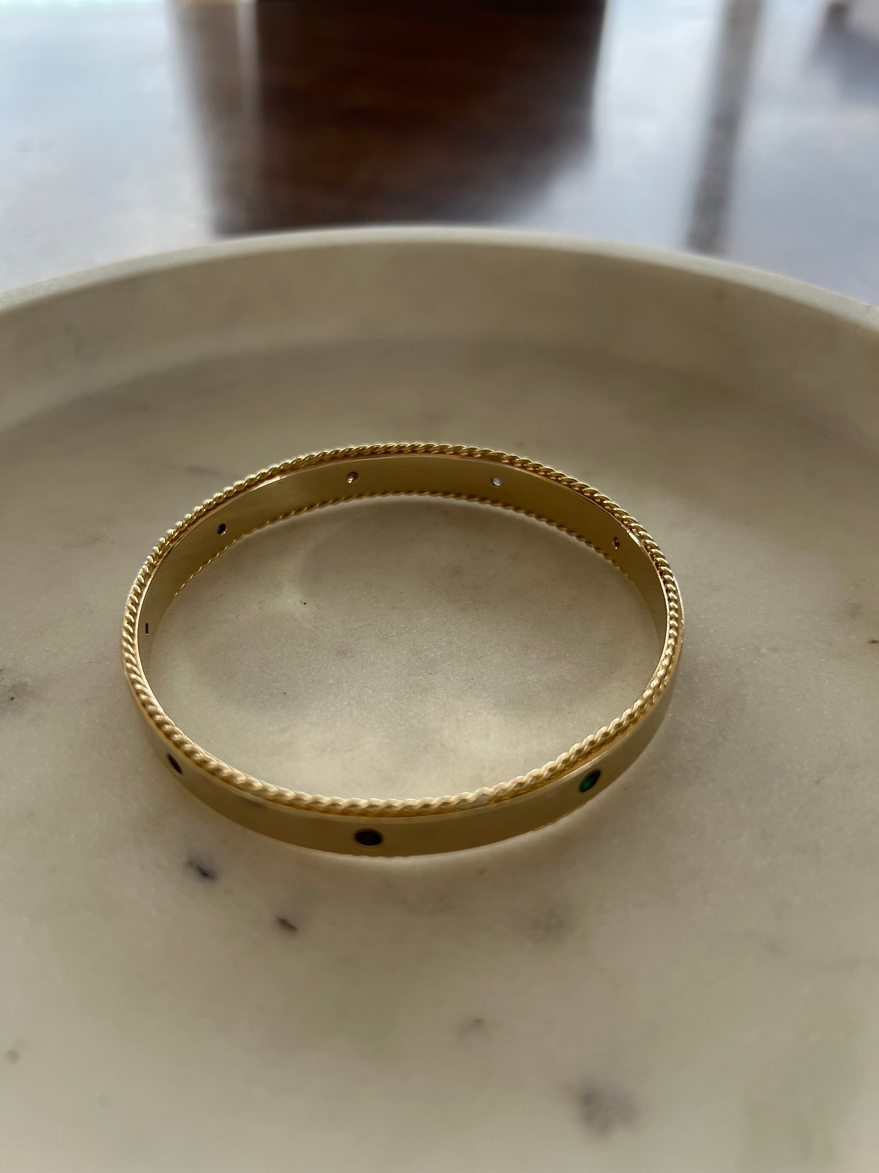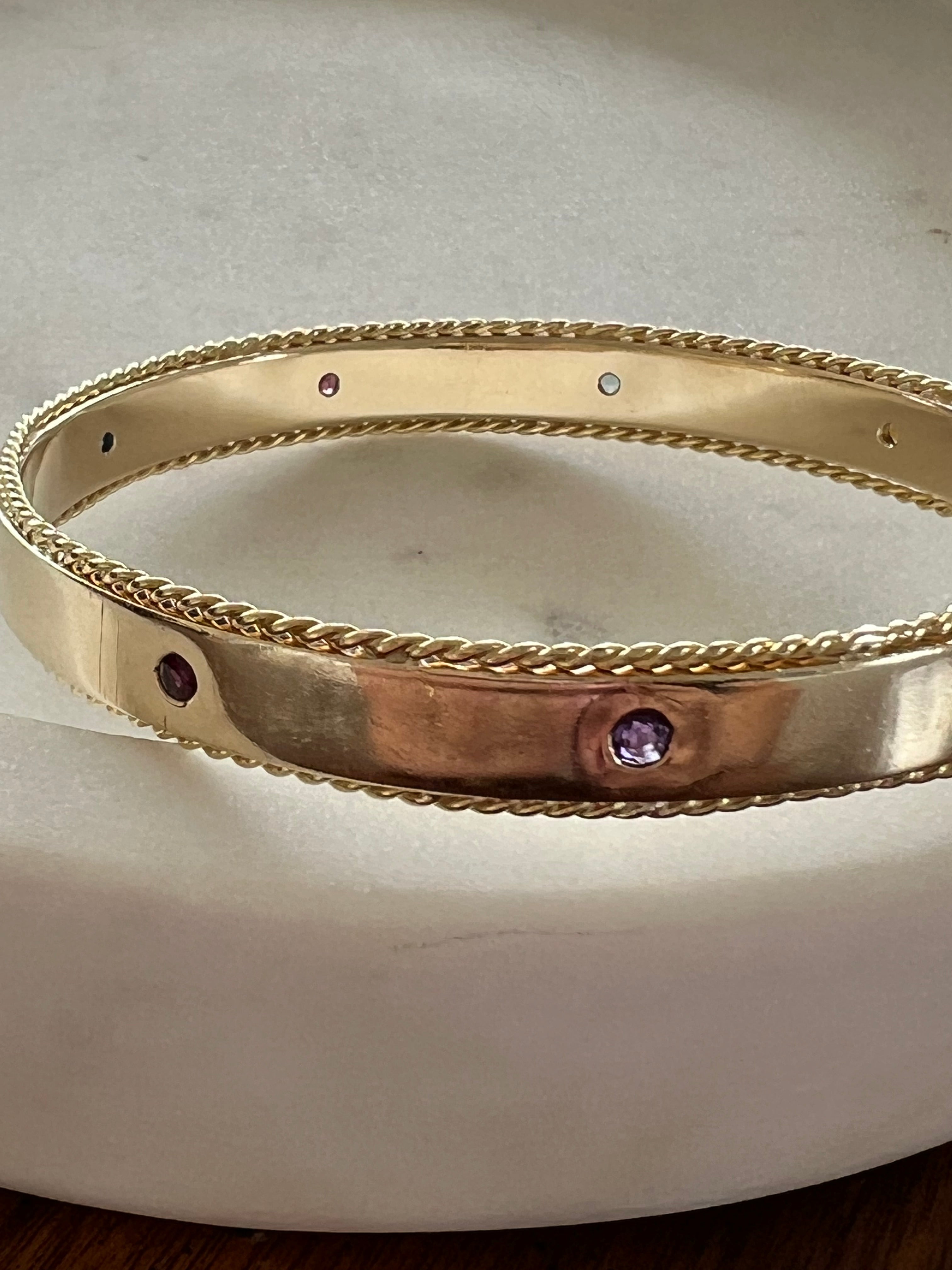 This custom-made bangle features one of everything! almost. A beautiful, solidly made bangle in 9ct yellow gold, set with nine different gems. All of the gems are a similar size except for a larger ruby. The bangle has a lovely twisted rope border on each side, and she weighs a hefty 45 grams, a lovely solid piece.