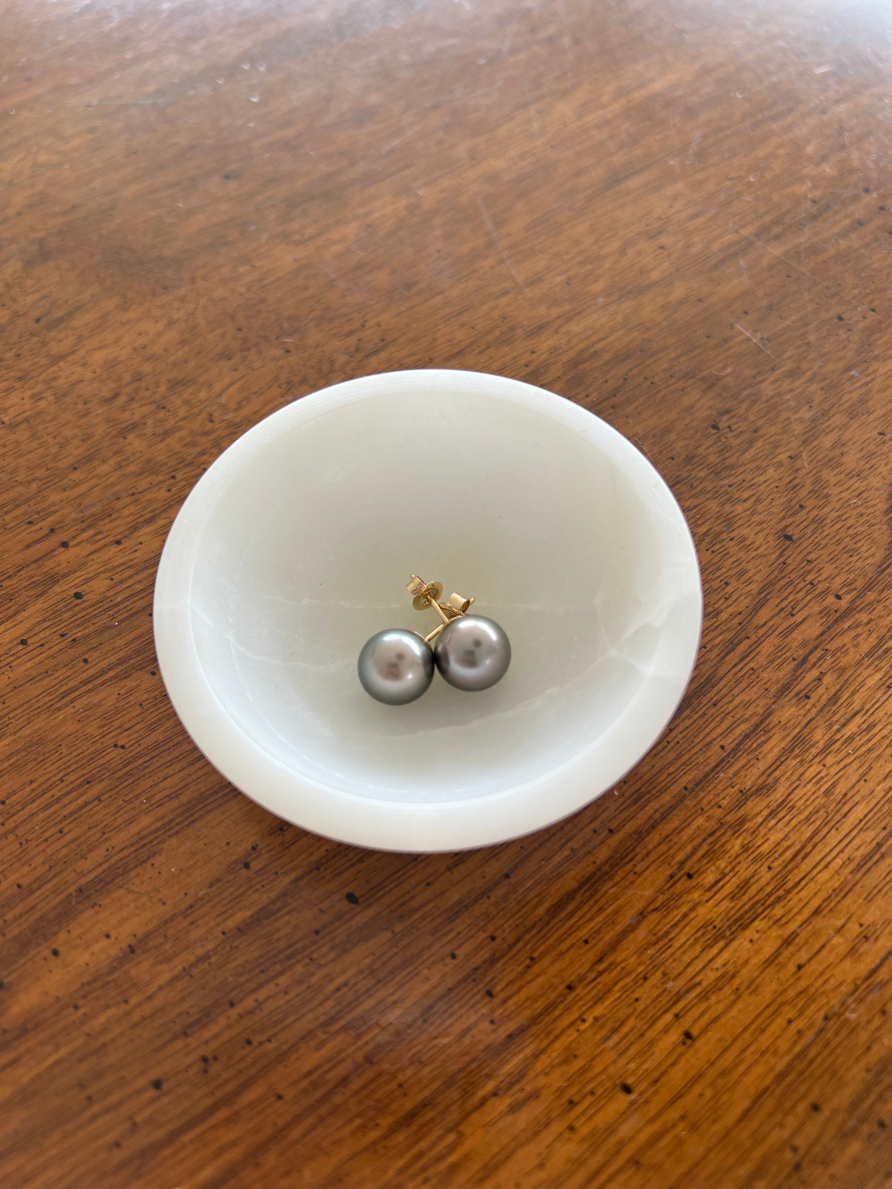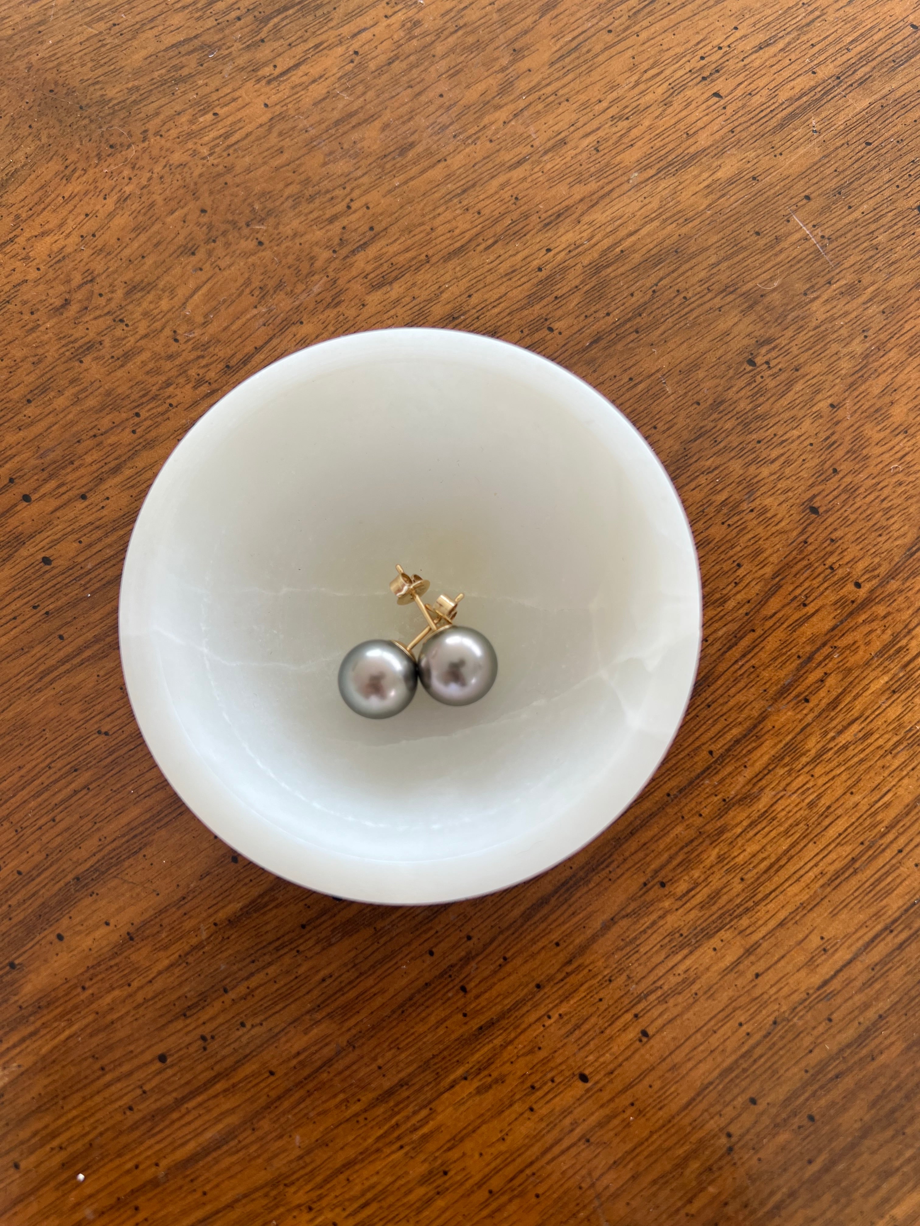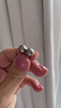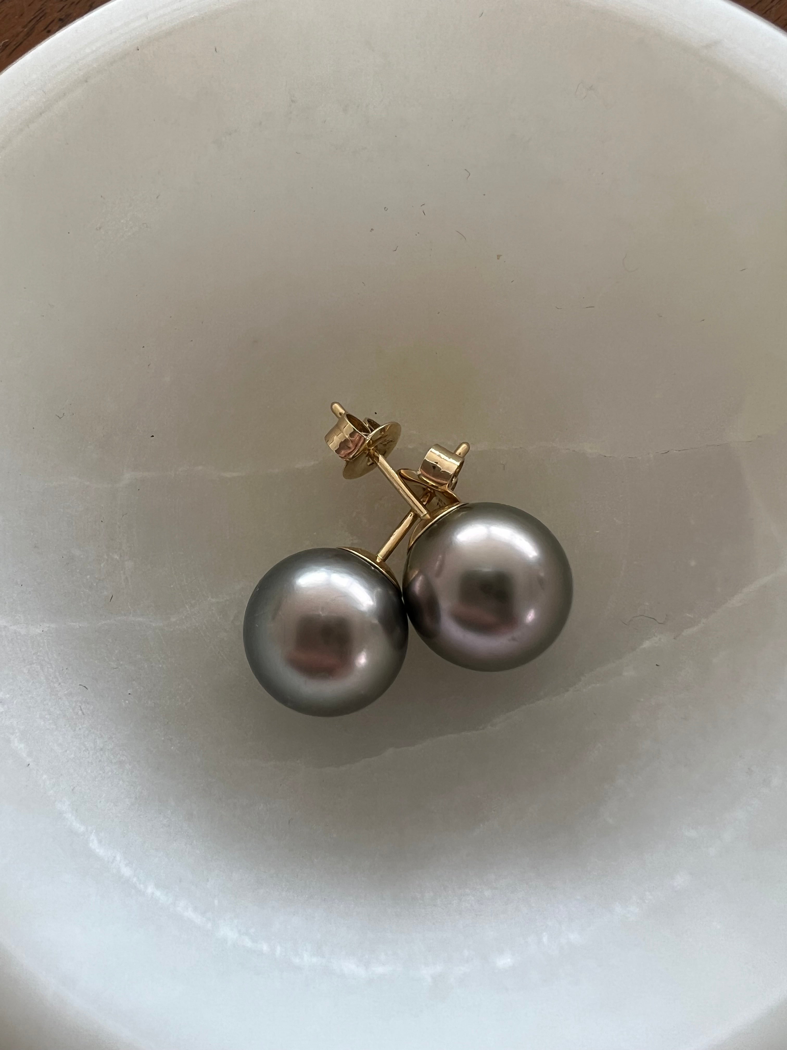 Two gorgeous dark grey Tahitian pearls with 9ct yellow gold posts and butterflies.
